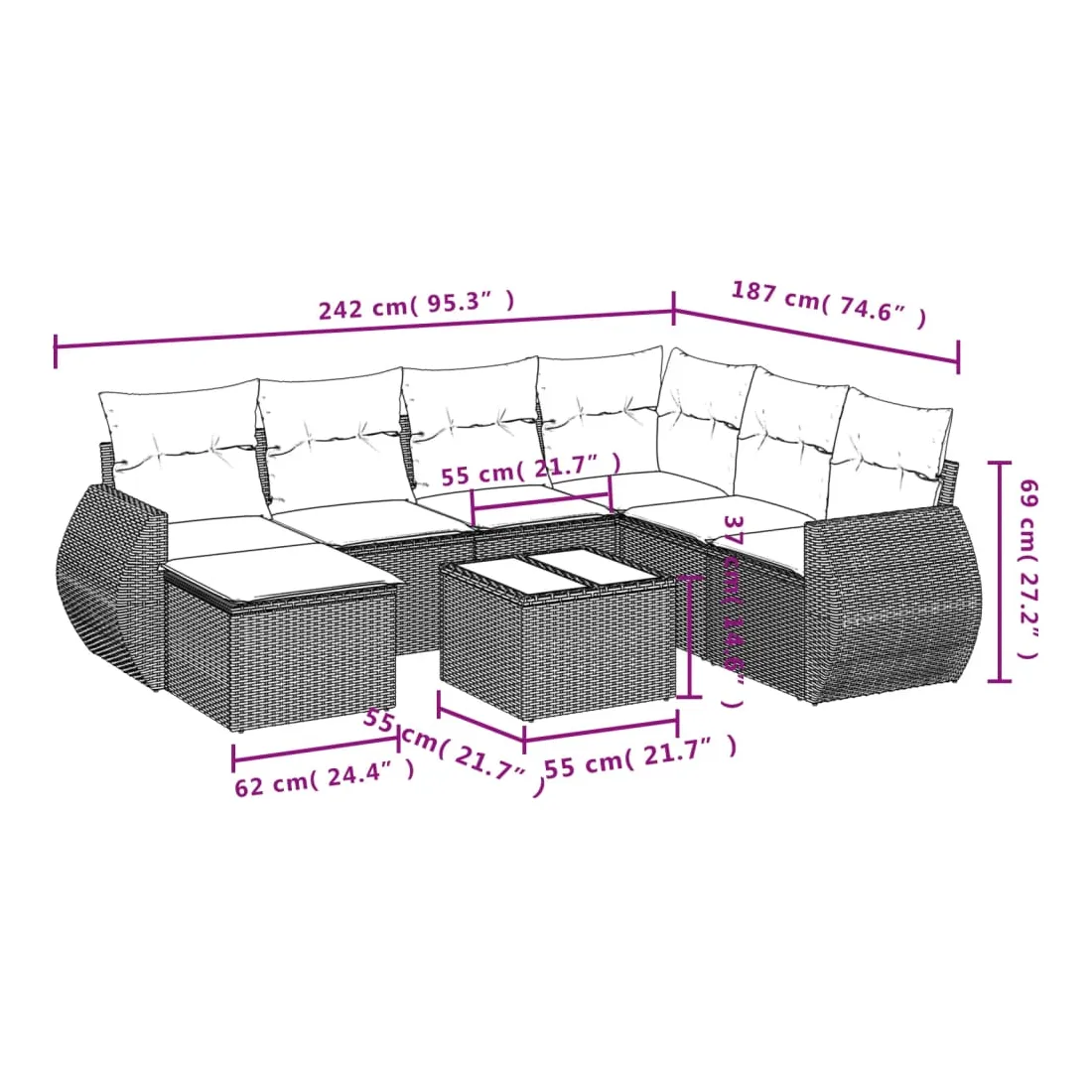 Cet ensemble de canapés de jardin est le complément parfait de votre arrière-cour, terrasse ou patio, offrant un espace confortable et accueillant pour discuter avec la famille et les amis ou simplement se détendre et profiter de l'extérieur. Matériau durable : la résine tressée, également connue sous le nom de poly rotin, est un matériau synthétique solide et nécessitant peu d'entretien qui ressemble au rotin naturel. Il est léger, facile à nettoyer et couramment utilisé pour les meubles d'extérieur en raison de sa durabilité et de ses propriétés de résistance aux intempéries.Fonction de rangement avec sac résistant à l'eau : chaque siège de jardin dispose d'un espace de rangement sous l'assise, complété par un sac résistant à l'eau pour ranger les coussins, les jouets et d'autres objets. Les sacs intérieurs sont dotés d'un couvercle et peuvent être solidement fixés aux sièges à l'aide de bandes auto-agrippantes pour plus de stabilité.Dessus en verre : le dessus de la table d'extérieur est fabriqué en verre trempé solide et durable, ce qui le rend facile à nettoyer avec un chiffon humide et ajoute une touche d'élégance à votre espace extérieur.Housse amovible et lavable : ces coussins de siège sont dotés de housses amovibles pour un lavage et un entretien faciles.Conception modulaire : cet ensemble de meubles d'extérieur a une conception modulaire, ce qui le rend complètement flexible et facile à déplacer, afin que vous puissiez créer un agencement de meubles d'extérieur personnalisé. Bon à savoir :Pour que vos meubles d'extérieur restent beaux, nous vous recommandons de les protéger avec une housse imperméable.