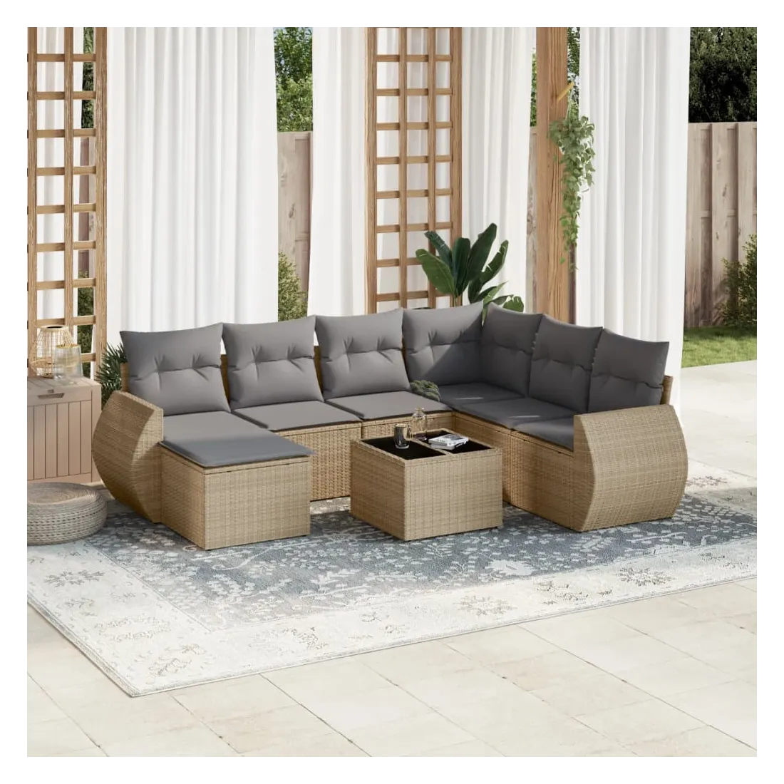 Cet ensemble de canapés de jardin est le complément parfait de votre arrière-cour, terrasse ou patio, offrant un espace confortable et accueillant pour discuter avec la famille et les amis ou simplement se détendre et profiter de l'extérieur. Matériau durable : la résine tressée, également connue sous le nom de poly rotin, est un matériau synthétique solide et nécessitant peu d'entretien qui ressemble au rotin naturel. Il est léger, facile à nettoyer et couramment utilisé pour les meubles d'extérieur en raison de sa durabilité et de ses propriétés de résistance aux intempéries.Fonction de rangement avec sac résistant à l'eau : chaque siège de jardin dispose d'un espace de rangement sous l'assise, complété par un sac résistant à l'eau pour ranger les coussins, les jouets et d'autres objets. Les sacs intérieurs sont dotés d'un couvercle et peuvent être solidement fixés aux sièges à l'aide de bandes auto-agrippantes pour plus de stabilité.Dessus en verre : le dessus de la table d'extérieur est fabriqué en verre trempé solide et durable, ce qui le rend facile à nettoyer avec un chiffon humide et ajoute une touche d'élégance à votre espace extérieur.Housse amovible et lavable : ces coussins de siège sont dotés de housses amovibles pour un lavage et un entretien faciles.Conception modulaire : cet ensemble de meubles d'extérieur a une conception modulaire, ce qui le rend complètement flexible et facile à déplacer, afin que vous puissiez créer un agencement de meubles d'extérieur personnalisé. Bon à savoir :Pour que vos meubles d'extérieur restent beaux, nous vous recommandons de les protéger avec une housse imperméable.