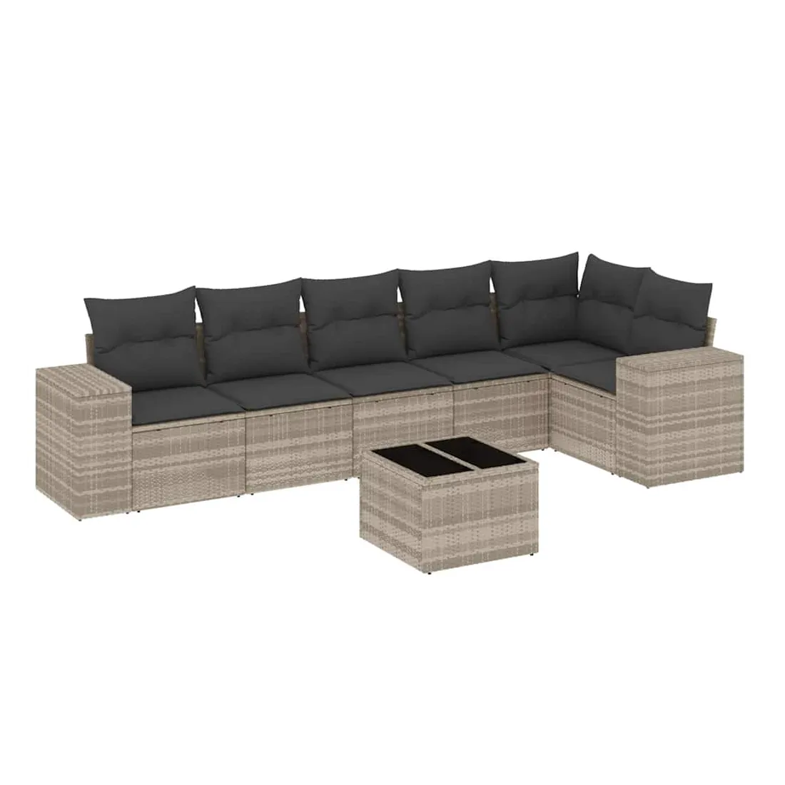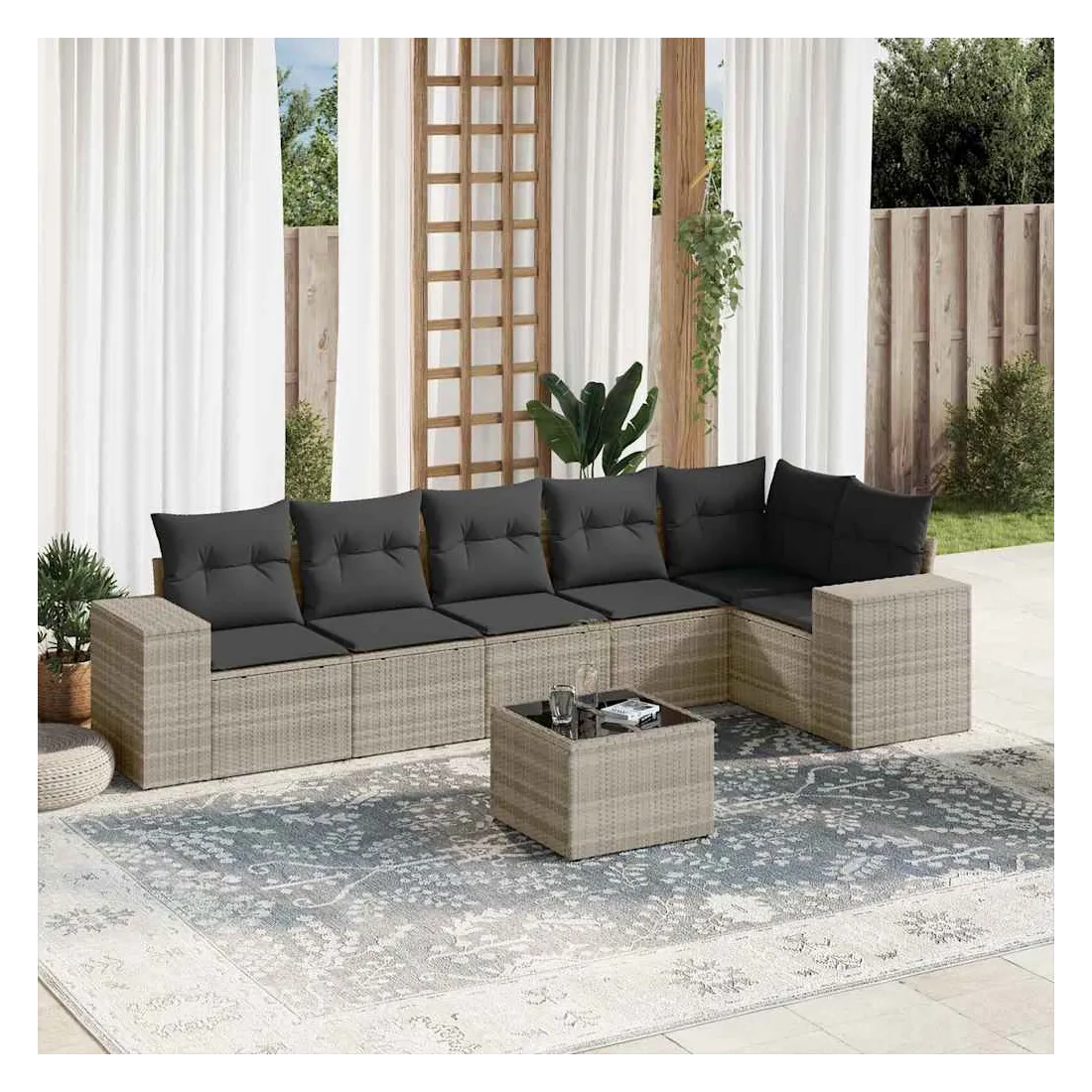 Cet ensemble de canapés de jardin est le complément parfait de votre arrière-cour, terrasse ou patio, offrant un espace confortable et accueillant pour discuter avec la famille et les amis ou simplement se détendre et profiter de l'extérieur. Matériau durable : la résine tressée, également connue sous le nom de poly rotin, est un matériau synthétique solide et nécessitant peu d'entretien qui ressemble au rotin naturel. Il est léger, facile à nettoyer et couramment utilisé pour les meubles d'extérieur en raison de sa durabilité et de ses propriétés de résistance aux intempéries.Fonction de rangement avec sac résistant à l'eau : le mobilier de jardin dispose d'un espace de rangement sous l'assise, complété par un sac résistant à l'eau pour ranger coussins, jouets et autres objets. Le sac intérieur peut être solidement fixé au mobilier d'extérieur grâce à des attaches auto-agrippantes pour plus de stabilité.Dessus en verre : le dessus de la table d'extérieur est fabriqué en verre trempé solide et durable, ce qui le rend facile à nettoyer avec un chiffon humide et ajoute une touche d'élégance à votre espace extérieur.Housse amovible et lavable : ces coussins de siège sont dotés de housses amovibles pour un lavage et un entretien faciles.Conception modulaire : cet ensemble de meubles d'extérieur a une conception modulaire, ce qui le rend complètement flexible et facile à déplacer, afin que vous puissiez créer un agencement de meubles d'extérieur personnalisé. Bon à savoir :Pour que vos meubles d'extérieur restent beaux, nous vous recommandons de les protéger avec une housse imperméable.