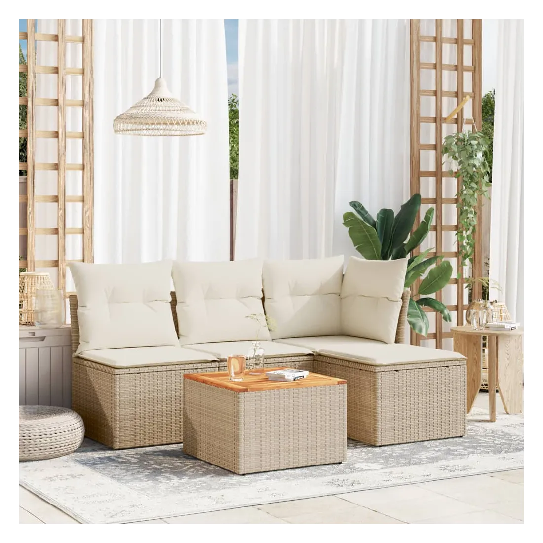 Cet ensemble de canapés de jardin est le complément parfait de votre arrière-cour, terrasse ou patio, offrant un espace confortable et accueillant pour discuter avec la famille et les amis ou simplement se détendre et profiter de l'extérieur. Matériau durable : la résine tressée, également connue sous le nom de poly rotin, est un matériau synthétique solide et nécessitant peu d'entretien qui ressemble au rotin naturel. Il est léger, facile à nettoyer et couramment utilisé pour les meubles d'extérieur en raison de sa durabilité et de ses propriétés de résistance aux intempéries.Fonction de rangement avec sac résistant à l'eau : chaque siège de jardin dispose d'un espace de rangement sous l'assise, complété par un sac résistant à l'eau pour ranger les coussins, les jouets et d'autres objets. Les sacs intérieurs sont dotés d'un couvercle et peuvent être solidement fixés aux sièges à l'aide de bandes auto-agrippantes pour plus de stabilité.Dessus stable et facile à nettoyer : cette table de jardin a un dessus en bois d'acacia robuste, durable et facile à nettoyer avec un chiffon humide.Pouf polyvalent : le tabouret est polyvalent, servant de repose-pieds confortable lorsque vous vous prélassez sur le canapé ou de siège supplémentaire dans votre jardin.Conception modulaire : cet ensemble de meubles d'extérieur a une conception modulaire, ce qui le rend complètement flexible et facile à déplacer, afin que vous puissiez créer un agencement de meubles d'extérieur personnalisé. Bon à savoir :Pour que vos meubles d'extérieur restent beaux, nous vous recommandons de les protéger avec une housse imperméable.