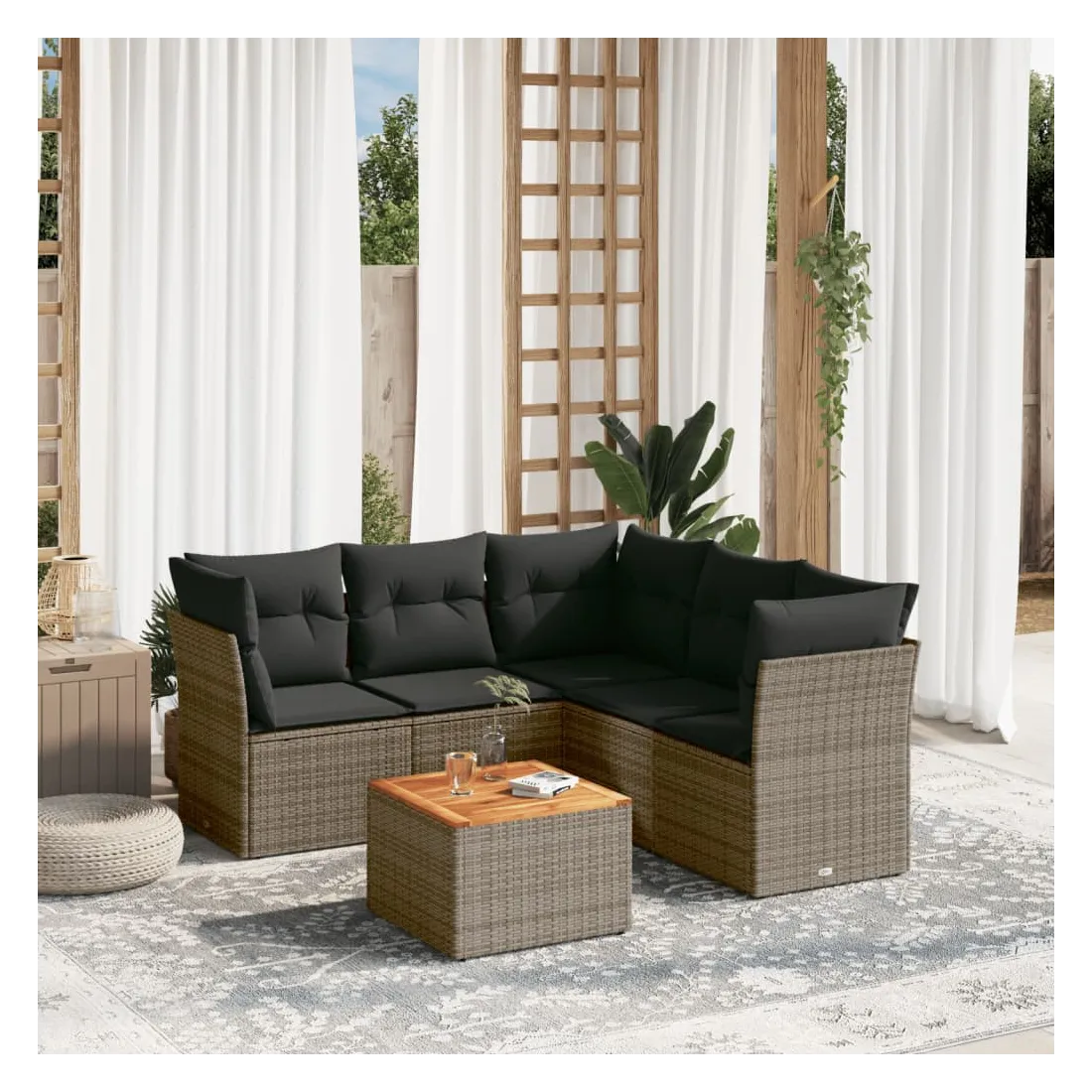 Cet ensemble de canapés de jardin est le complément parfait de votre arrière-cour, terrasse ou patio, offrant un espace confortable et accueillant pour discuter avec la famille et les amis ou simplement se détendre et profiter de l'extérieur. Matériau durable : la résine tressée, également connue sous le nom de poly rotin, est un matériau synthétique solide et nécessitant peu d'entretien qui ressemble au rotin naturel. Il est léger, facile à nettoyer et couramment utilisé pour les meubles d'extérieur en raison de sa durabilité et de ses propriétés de résistance aux intempéries.Fonction de rangement avec sac résistant à l'eau : chaque siège de jardin dispose d'un espace de rangement sous l'assise, complété par un sac résistant à l'eau pour ranger les coussins, les jouets et d'autres objets. Les sacs intérieurs sont dotés d'un couvercle et peuvent être solidement fixés aux sièges à l'aide de bandes auto-agrippantes pour plus de stabilité.Dessus stable et facile à nettoyer : cette table de jardin a un dessus en bois d'acacia robuste, durable et facile à nettoyer avec un chiffon humide.Housse amovible et lavable : ces coussins de siège sont dotés de housses amovibles pour un lavage et un entretien faciles.Conception modulaire : cet ensemble de meubles d'extérieur a une conception modulaire, ce qui le rend complètement flexible et facile à déplacer, afin que vous puissiez créer un agencement de meubles d'extérieur personnalisé. Bon à savoir :Pour que vos meubles d'extérieur restent beaux, nous vous recommandons de les protéger avec une housse imperméable.