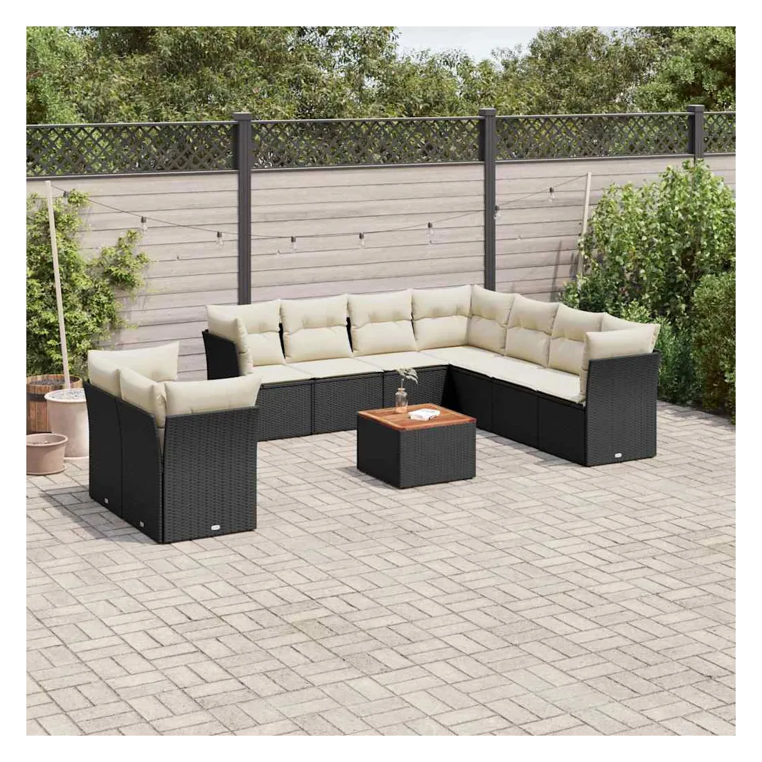 Cet ensemble de canapés de jardin est le complément parfait de votre arrière-cour, terrasse ou patio, offrant un espace confortable et accueillant pour discuter avec la famille et les amis ou simplement se détendre et profiter de l'extérieur. Matériau durable : la résine tressée, également connue sous le nom de poly rotin, est un matériau synthétique solide et nécessitant peu d'entretien qui ressemble au rotin naturel. Il est léger, facile à nettoyer et couramment utilisé pour les meubles d'extérieur en raison de sa durabilité et de ses propriétés de résistance aux intempéries.Fonction de rangement avec sac résistant à l'eau : chaque siège de jardin dispose d'un espace de rangement sous l'assise, complété par un sac résistant à l'eau pour ranger les coussins, les jouets et d'autres objets. Les sacs intérieurs sont dotés d'un couvercle et peuvent être solidement fixés aux sièges à l'aide de bandes auto-agrippantes pour plus de stabilité.Dessus stable et facile à nettoyer : cette table de jardin a un dessus en bois d'acacia robuste, durable et facile à nettoyer avec un chiffon humide.Housse amovible et lavable : ces coussins de siège sont dotés de housses amovibles pour un lavage et un entretien faciles.Conception modulaire : cet ensemble de meubles d'extérieur a une conception modulaire, ce qui le rend complètement flexible et facile à déplacer, afin que vous puissiez créer un agencement de meubles d'extérieur personnalisé. Bon à savoir :Pour que vos meubles d'extérieur restent beaux, nous vous recommandons de les protéger avec une housse imperméable.