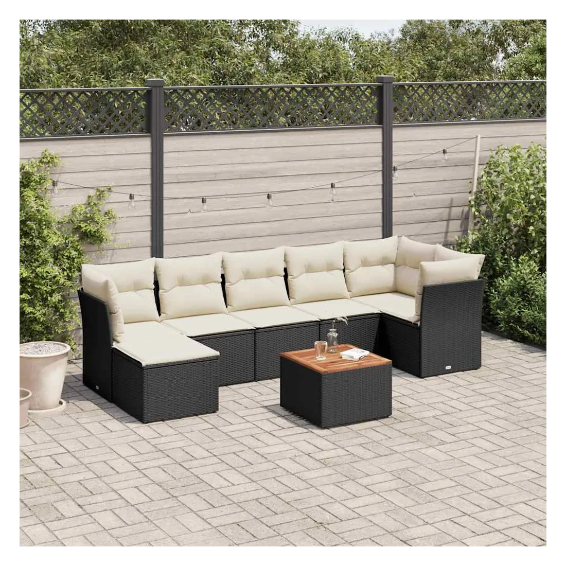 Cet ensemble de canapés de jardin est le complément parfait de votre arrière-cour, terrasse ou patio, offrant un espace confortable et accueillant pour discuter avec la famille et les amis ou simplement se détendre et profiter de l'extérieur. Matériau durable : la résine tressée, également connue sous le nom de poly rotin, est un matériau synthétique solide et nécessitant peu d'entretien qui ressemble au rotin naturel. Il est léger, facile à nettoyer et couramment utilisé pour les meubles d'extérieur en raison de sa durabilité et de ses propriétés de résistance aux intempéries.Fonction de rangement avec sac résistant à l'eau : chaque siège de jardin dispose d'un espace de rangement sous l'assise, complété par un sac résistant à l'eau pour ranger les coussins, les jouets et d'autres objets. Les sacs intérieurs sont dotés d'un couvercle et peuvent être solidement fixés aux sièges à l'aide de bandes auto-agrippantes pour plus de stabilité.Dessus stable et facile à nettoyer : cette table de jardin a un dessus en bois d'acacia robuste, durable et facile à nettoyer avec un chiffon humide.Pouf polyvalent : le tabouret est polyvalent, servant de repose-pieds confortable lorsque vous vous prélassez sur le canapé ou de siège supplémentaire dans votre jardin.Conception modulaire : cet ensemble de meubles d'extérieur a une conception modulaire, ce qui le rend complètement flexible et facile à déplacer, afin que vous puissiez créer un agencement de meubles d'extérieur personnalisé. Bon à savoir :Pour que vos meubles d'extérieur restent beaux, nous vous recommandons de les protéger avec une housse imperméable.