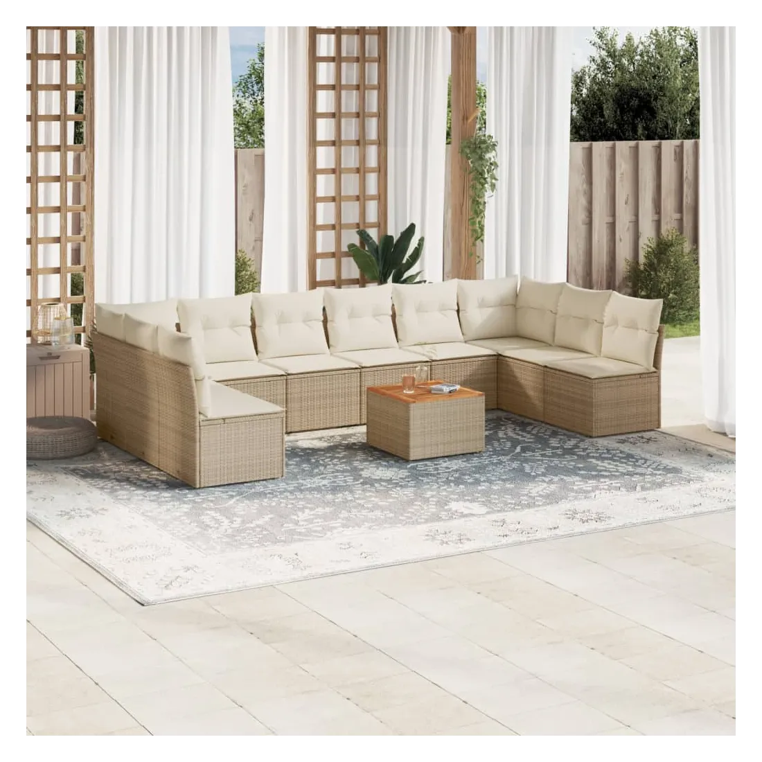 Cet ensemble de canapés de jardin est le complément parfait de votre arrière-cour, terrasse ou patio, offrant un espace confortable et accueillant pour discuter avec la famille et les amis ou simplement se détendre et profiter de l'extérieur. Matériau durable : la résine tressée, également connue sous le nom de poly rotin, est un matériau synthétique solide et nécessitant peu d'entretien qui ressemble au rotin naturel. Il est léger, facile à nettoyer et couramment utilisé pour les meubles d'extérieur en raison de sa durabilité et de ses propriétés de résistance aux intempéries.Fonction de rangement avec sac résistant à l'eau : chaque siège de jardin dispose d'un espace de rangement sous l'assise, complété par un sac résistant à l'eau pour ranger les coussins, les jouets et d'autres objets. Les sacs intérieurs sont dotés d'un couvercle et peuvent être solidement fixés aux sièges à l'aide de bandes auto-agrippantes pour plus de stabilité.Dessus stable et facile à nettoyer : cette table de jardin a un dessus en bois d'acacia robuste, durable et facile à nettoyer avec un chiffon humide.Housse amovible et lavable : ces coussins de siège sont dotés de housses amovibles pour un lavage et un entretien faciles.Conception modulaire : cet ensemble de meubles d'extérieur a une conception modulaire, ce qui le rend complètement flexible et facile à déplacer, afin que vous puissiez créer un agencement de meubles d'extérieur personnalisé. Bon à savoir :Pour que vos meubles d'extérieur restent beaux, nous vous recommandons de les protéger avec une housse imperméable.