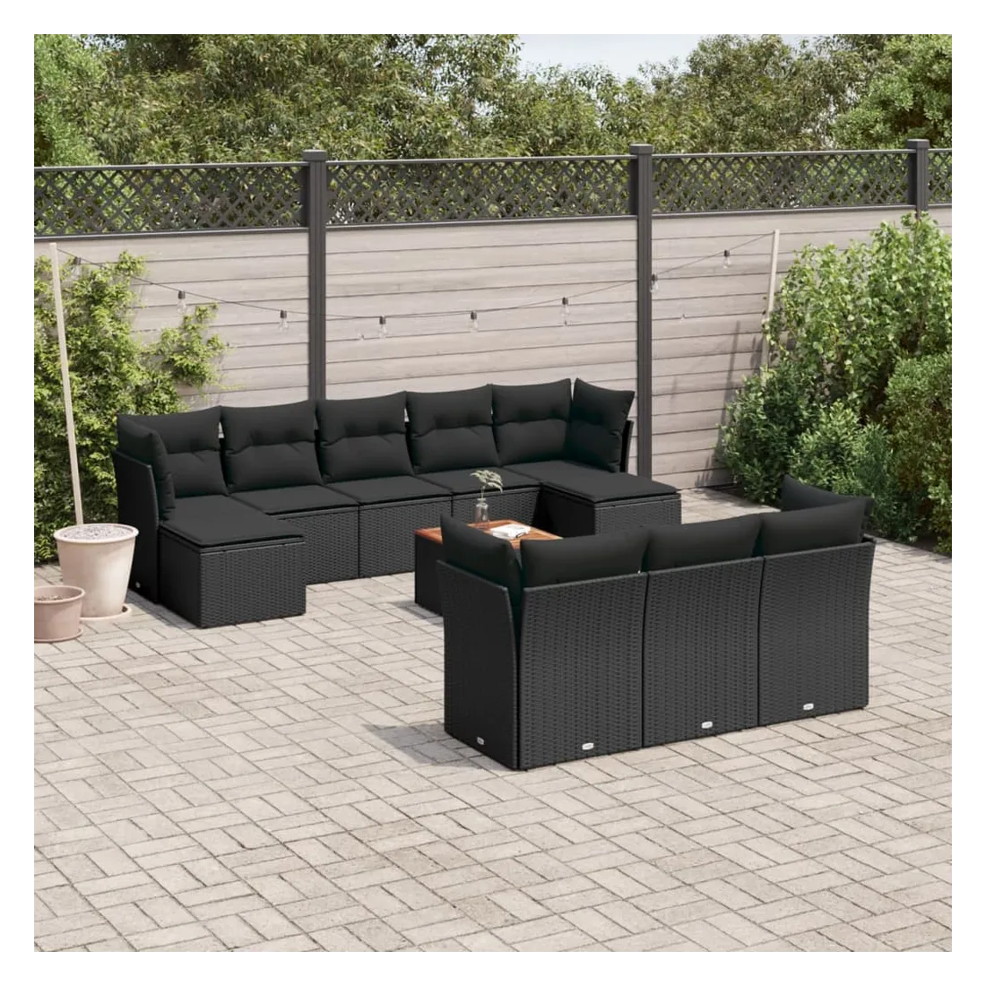 Cet ensemble de canapés de jardin est le complément parfait de votre arrière-cour, terrasse ou patio, offrant un espace confortable et accueillant pour discuter avec la famille et les amis ou simplement se détendre et profiter de l'extérieur. Matériau durable : la résine tressée, également connue sous le nom de poly rotin, est un matériau synthétique solide et nécessitant peu d'entretien qui ressemble au rotin naturel. Il est léger, facile à nettoyer et couramment utilisé pour les meubles d'extérieur en raison de sa durabilité et de ses propriétés de résistance aux intempéries.Fonction de rangement avec sac résistant à l'eau : chaque siège de jardin dispose d'un espace de rangement sous l'assise, complété par un sac résistant à l'eau pour ranger les coussins, les jouets et d'autres objets. Les sacs intérieurs sont dotés d'un couvercle et peuvent être solidement fixés aux sièges à l'aide de bandes auto-agrippantes pour plus de stabilité.Dessus stable et facile à nettoyer : cette table de jardin a un dessus en bois d'acacia robuste, durable et facile à nettoyer avec un chiffon humide.Pouf polyvalent : le tabouret est polyvalent, servant de repose-pieds confortable lorsque vous vous prélassez sur le canapé ou de siège supplémentaire dans votre jardin.Conception modulaire : cet ensemble de meubles d'extérieur a une conception modulaire, ce qui le rend complètement flexible et facile à déplacer, afin que vous puissiez créer un agencement de meubles d'extérieur personnalisé. Bon à savoir :Pour que vos meubles d'extérieur restent beaux, nous vous recommandons de les protéger avec une housse imperméable.