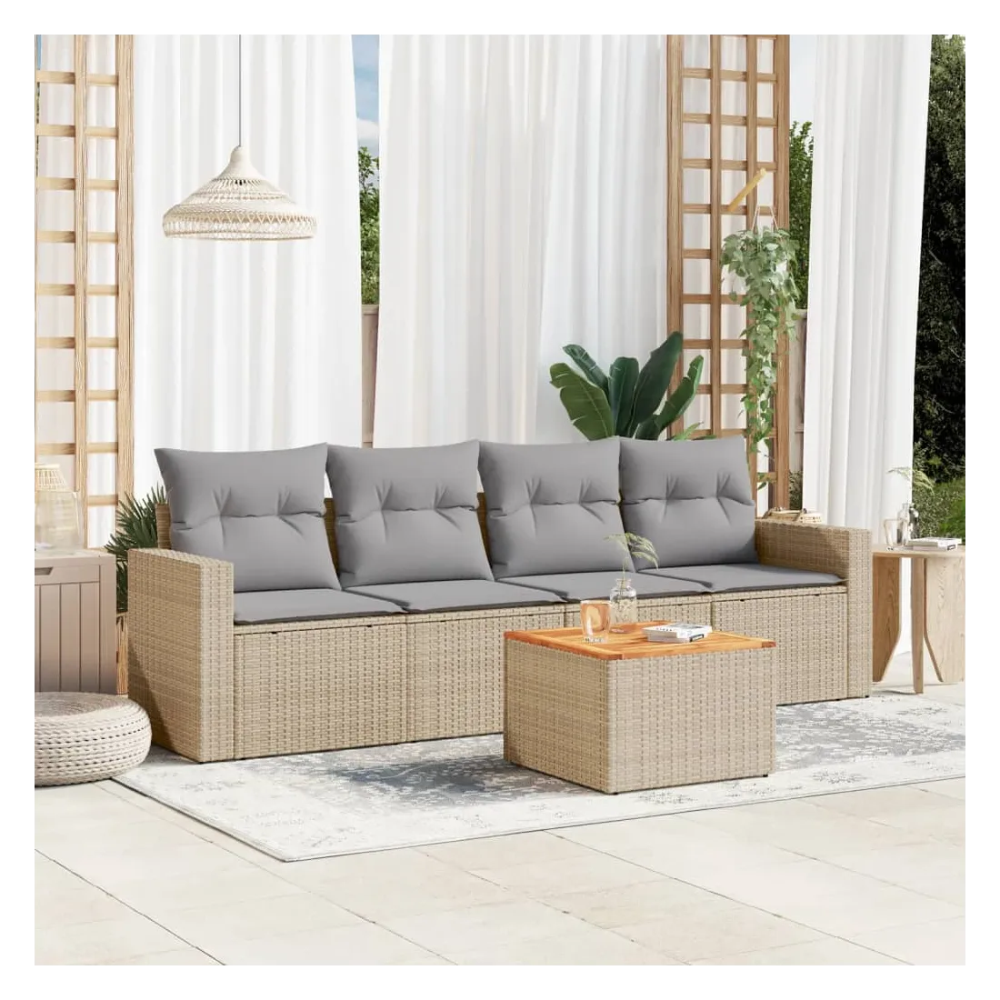 Cet ensemble de canapés de jardin est le complément parfait de votre arrière-cour, terrasse ou patio, offrant un espace confortable et accueillant pour discuter avec la famille et les amis ou simplement se détendre et profiter de l'extérieur. Matériau durable : la résine tressée, également connue sous le nom de poly rotin, est un matériau synthétique solide et nécessitant peu d'entretien qui ressemble au rotin naturel. Il est léger, facile à nettoyer et couramment utilisé pour les meubles d'extérieur en raison de sa durabilité et de ses propriétés de résistance aux intempéries.Fonction de rangement avec sac résistant à l'eau : chaque siège de jardin dispose d'un espace de rangement sous l'assise, complété par un sac résistant à l'eau pour ranger les coussins, les jouets et d'autres objets. Les sacs intérieurs sont dotés d'un couvercle et peuvent être solidement fixés aux sièges à l'aide de bandes auto-agrippantes pour plus de stabilité.Dessus stable et facile à nettoyer : cette table de jardin a un dessus en bois d'acacia robuste, durable et facile à nettoyer avec un chiffon humide.Housse amovible et lavable : ces coussins de siège sont dotés de housses amovibles pour un lavage et un entretien faciles.Conception modulaire : cet ensemble de meubles d'extérieur a une conception modulaire, ce qui le rend complètement flexible et facile à déplacer, afin que vous puissiez créer un agencement de meubles d'extérieur personnalisé. Bon à savoir :Pour que vos meubles d'extérieur restent beaux, nous vous recommandons de les protéger avec une housse imperméable.