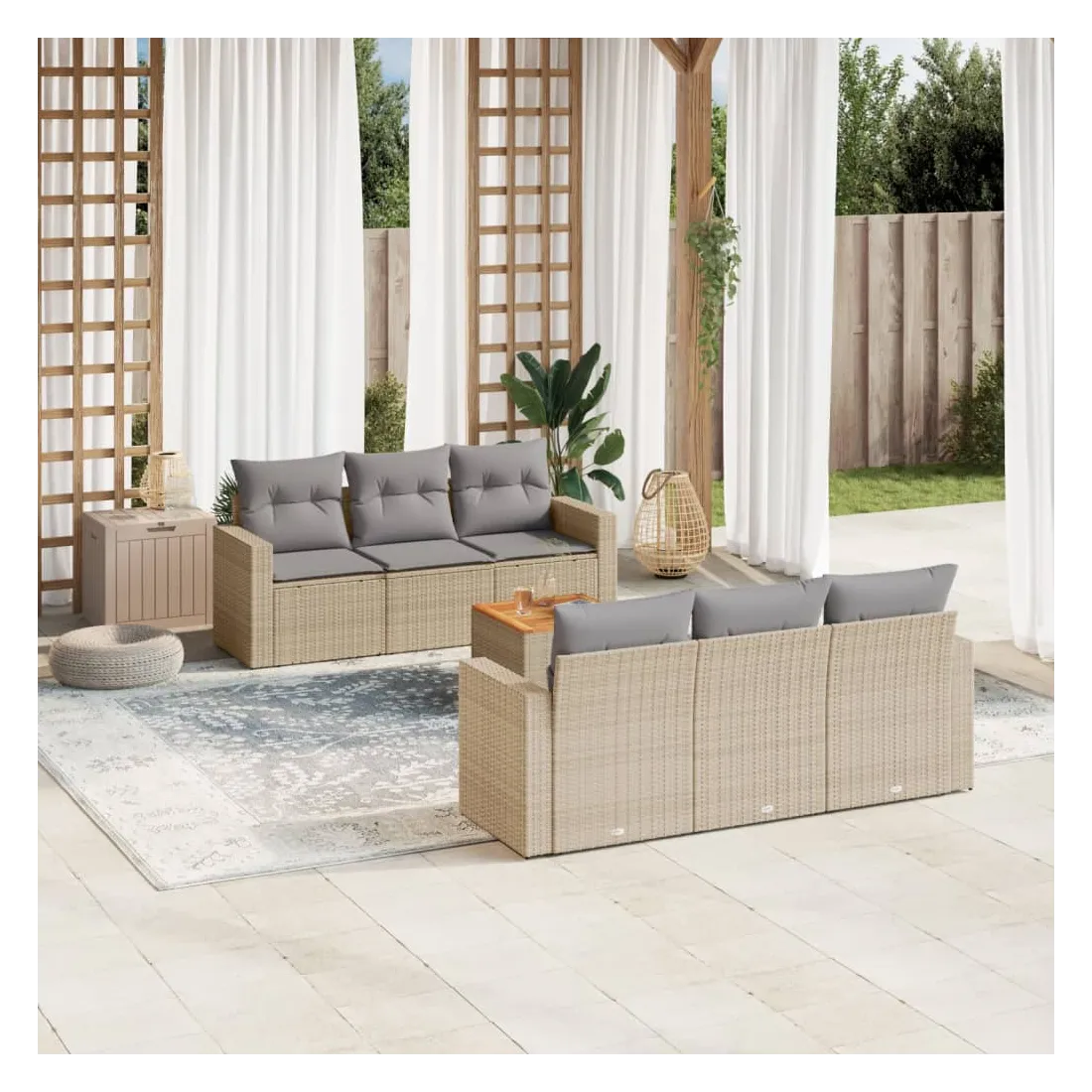 Cet ensemble de canapés de jardin est le complément parfait de votre arrière-cour, terrasse ou patio, offrant un espace confortable et accueillant pour discuter avec la famille et les amis ou simplement se détendre et profiter de l'extérieur. Matériau durable : la résine tressée, également connue sous le nom de poly rotin, est un matériau synthétique solide et nécessitant peu d'entretien qui ressemble au rotin naturel. Il est léger, facile à nettoyer et couramment utilisé pour les meubles d'extérieur en raison de sa durabilité et de ses propriétés de résistance aux intempéries.Fonction de rangement avec sac résistant à l'eau : chaque siège de jardin dispose d'un espace de rangement sous l'assise, complété par un sac résistant à l'eau pour ranger les coussins, les jouets et d'autres objets. Les sacs intérieurs sont dotés d'un couvercle et peuvent être solidement fixés aux sièges à l'aide de bandes auto-agrippantes pour plus de stabilité.Dessus stable et facile à nettoyer : cette table de jardin a un dessus en bois d'acacia robuste, durable et facile à nettoyer avec un chiffon humide.Housse amovible et lavable : ces coussins de siège sont dotés de housses amovibles pour un lavage et un entretien faciles.Conception modulaire : cet ensemble de meubles d'extérieur a une conception modulaire, ce qui le rend complètement flexible et facile à déplacer, afin que vous puissiez créer un agencement de meubles d'extérieur personnalisé. Bon à savoir :Pour que vos meubles d'extérieur restent beaux, nous vous recommandons de les protéger avec une housse imperméable.