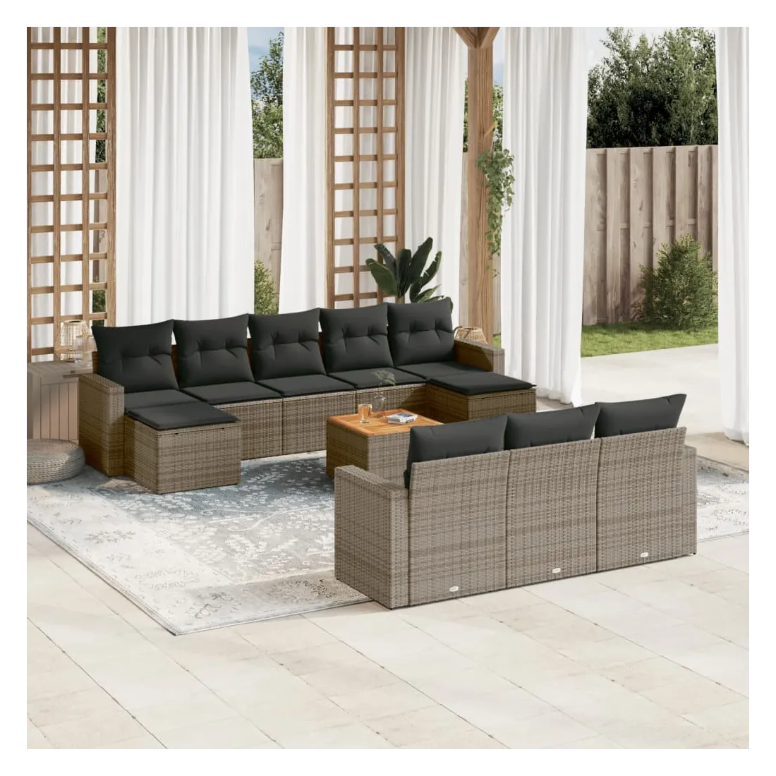 Cet ensemble de canapés de jardin est le complément parfait de votre arrière-cour, terrasse ou patio, offrant un espace confortable et accueillant pour discuter avec la famille et les amis ou simplement se détendre et profiter de l'extérieur. Matériau durable : la résine tressée, également connue sous le nom de poly rotin, est un matériau synthétique solide et nécessitant peu d'entretien qui ressemble au rotin naturel. Il est léger, facile à nettoyer et couramment utilisé pour les meubles d'extérieur en raison de sa durabilité et de ses propriétés de résistance aux intempéries.Fonction de rangement avec sac résistant à l'eau : chaque siège de jardin dispose d'un espace de rangement sous l'assise, complété par un sac résistant à l'eau pour ranger les coussins, les jouets et d'autres objets. Les sacs intérieurs sont dotés d'un couvercle et peuvent être solidement fixés aux sièges à l'aide de bandes auto-agrippantes pour plus de stabilité.Dessus stable et facile à nettoyer : cette table de jardin a un dessus en bois d'acacia robuste, durable et facile à nettoyer avec un chiffon humide.Pouf polyvalent : le tabouret est polyvalent, servant de repose-pieds confortable lorsque vous vous prélassez sur le canapé ou de siège supplémentaire dans votre jardin.Conception modulaire : cet ensemble de meubles d'extérieur a une conception modulaire, ce qui le rend complètement flexible et facile à déplacer, afin que vous puissiez créer un agencement de meubles d'extérieur personnalisé. Bon à savoir :Pour que vos meubles d'extérieur restent beaux, nous vous recommandons de les protéger avec une housse imperméable.