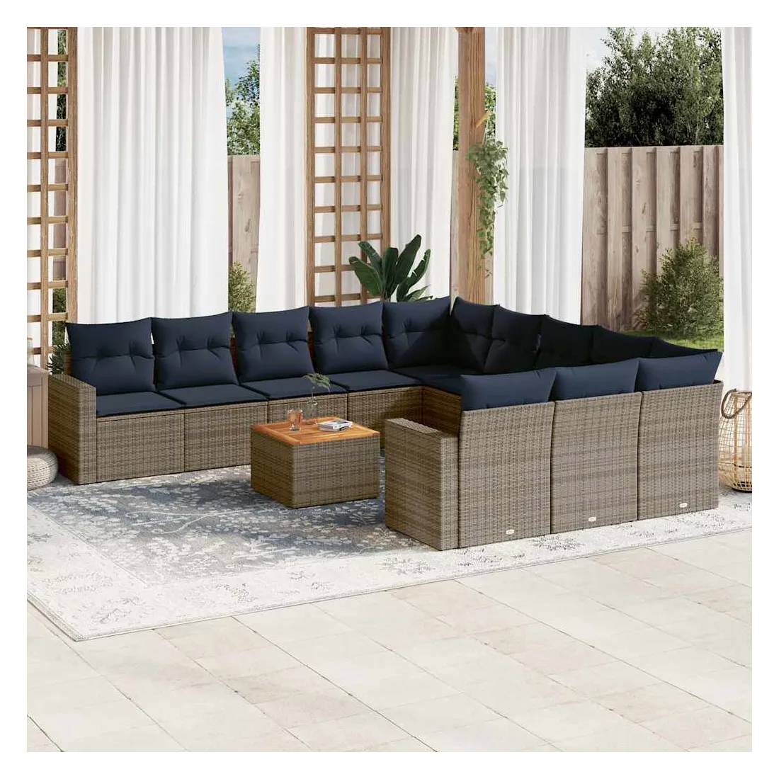 Cet ensemble de canapés de jardin est le complément parfait de votre arrière-cour, terrasse ou patio, offrant un espace confortable et accueillant pour discuter avec la famille et les amis ou simplement se détendre et profiter de l'extérieur. Matériau durable : la résine tressée, également connue sous le nom de poly rotin, est un matériau synthétique solide et nécessitant peu d'entretien qui ressemble au rotin naturel. Il est léger, facile à nettoyer et couramment utilisé pour les meubles d'extérieur en raison de sa durabilité et de ses propriétés de résistance aux intempéries.Fonction de rangement avec sac résistant à l'eau : chaque siège de jardin dispose d'un espace de rangement sous l'assise, complété par un sac résistant à l'eau pour ranger les coussins, les jouets et d'autres objets. Les sacs intérieurs sont dotés d'un couvercle et peuvent être solidement fixés aux sièges à l'aide de bandes auto-agrippantes pour plus de stabilité.Dessus stable et facile à nettoyer : cette table de jardin a un dessus en bois d'acacia robuste, durable et facile à nettoyer avec un chiffon humide.Housse amovible et lavable : ces coussins de siège sont dotés de housses amovibles pour un lavage et un entretien faciles.Conception modulaire : cet ensemble de meubles d'extérieur a une conception modulaire, ce qui le rend complètement flexible et facile à déplacer, afin que vous puissiez créer un agencement de meubles d'extérieur personnalisé. Bon à savoir :Pour que vos meubles d'extérieur restent beaux, nous vous recommandons de les protéger avec une housse imperméable.