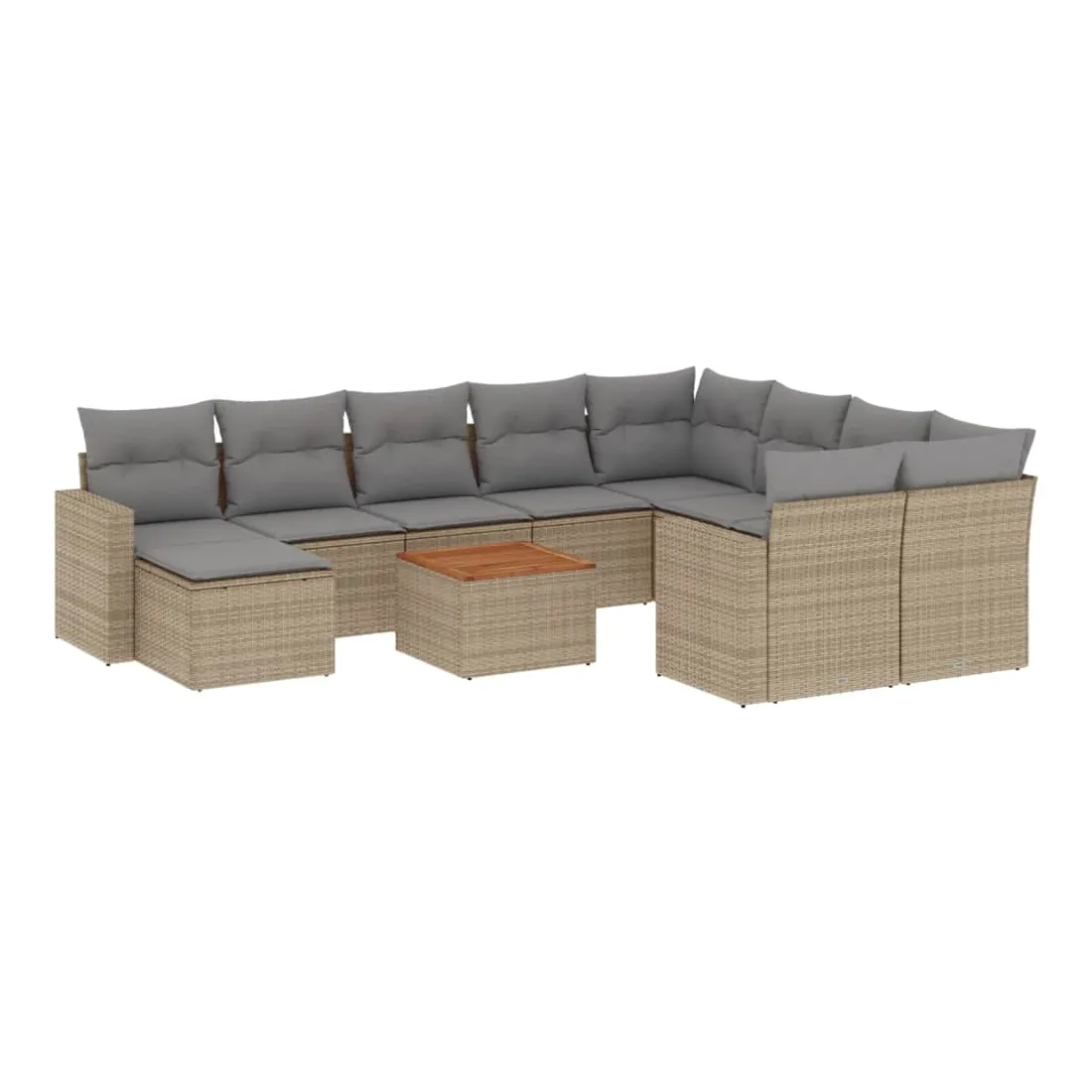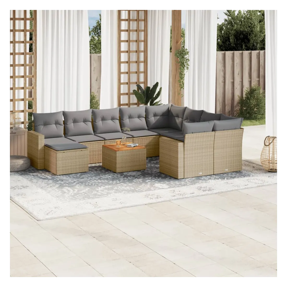 Cet ensemble de canapés de jardin est le complément parfait de votre arrière-cour, terrasse ou patio, offrant un espace confortable et accueillant pour discuter avec la famille et les amis ou simplement se détendre et profiter de l'extérieur. Matériau durable : la résine tressée, également connue sous le nom de poly rotin, est un matériau synthétique solide et nécessitant peu d'entretien qui ressemble au rotin naturel. Il est léger, facile à nettoyer et couramment utilisé pour les meubles d'extérieur en raison de sa durabilité et de ses propriétés de résistance aux intempéries.Fonction de rangement avec sac résistant à l'eau : chaque siège de jardin dispose d'un espace de rangement sous l'assise, complété par un sac résistant à l'eau pour ranger les coussins, les jouets et d'autres objets. Les sacs intérieurs sont dotés d'un couvercle et peuvent être solidement fixés aux sièges à l'aide de bandes auto-agrippantes pour plus de stabilité.Dessus stable et facile à nettoyer : cette table de jardin a un dessus en bois d'acacia robuste, durable et facile à nettoyer avec un chiffon humide.Pouf polyvalent : le tabouret est polyvalent, servant de repose-pieds confortable lorsque vous vous prélassez sur le canapé ou de siège supplémentaire dans votre jardin.Conception modulaire : cet ensemble de meubles d'extérieur a une conception modulaire, ce qui le rend complètement flexible et facile à déplacer, afin que vous puissiez créer un agencement de meubles d'extérieur personnalisé. Bon à savoir :Pour que vos meubles d'extérieur restent beaux, nous vous recommandons de les protéger avec une housse imperméable.