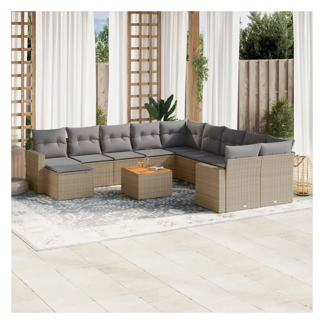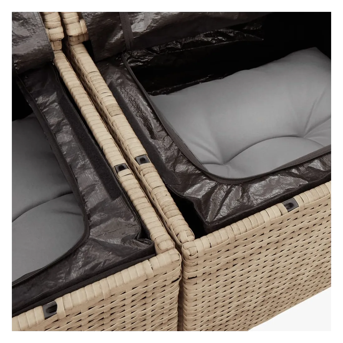Cet ensemble de canapés de jardin est le complément parfait de votre arrière-cour, terrasse ou patio, offrant un espace confortable et accueillant pour discuter avec la famille et les amis ou simplement se détendre et profiter de l'extérieur. Matériau durable : la résine tressée, également connue sous le nom de poly rotin, est un matériau synthétique solide et nécessitant peu d'entretien qui ressemble au rotin naturel. Il est léger, facile à nettoyer et couramment utilisé pour les meubles d'extérieur en raison de sa durabilité et de ses propriétés de résistance aux intempéries.Fonction de rangement avec sac résistant à l'eau : chaque siège de jardin dispose d'un espace de rangement sous l'assise, complété par un sac résistant à l'eau pour ranger les coussins, les jouets et d'autres objets. Les sacs intérieurs sont dotés d'un couvercle et peuvent être solidement fixés aux sièges à l'aide de bandes auto-agrippantes pour plus de stabilité.Dessus stable et facile à nettoyer : cette table de jardin a un dessus en bois d'acacia robuste, durable et facile à nettoyer avec un chiffon humide.Pouf polyvalent : le tabouret est polyvalent, servant de repose-pieds confortable lorsque vous vous prélassez sur le canapé ou de siège supplémentaire dans votre jardin.Conception modulaire : cet ensemble de meubles d'extérieur a une conception modulaire, ce qui le rend complètement flexible et facile à déplacer, afin que vous puissiez créer un agencement de meubles d'extérieur personnalisé. Bon à savoir :Pour que vos meubles d'extérieur restent beaux, nous vous recommandons de les protéger avec une housse imperméable.