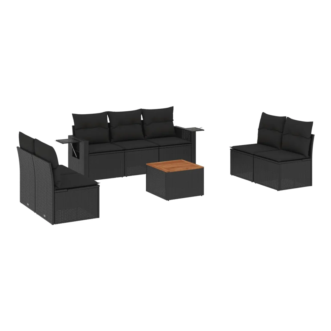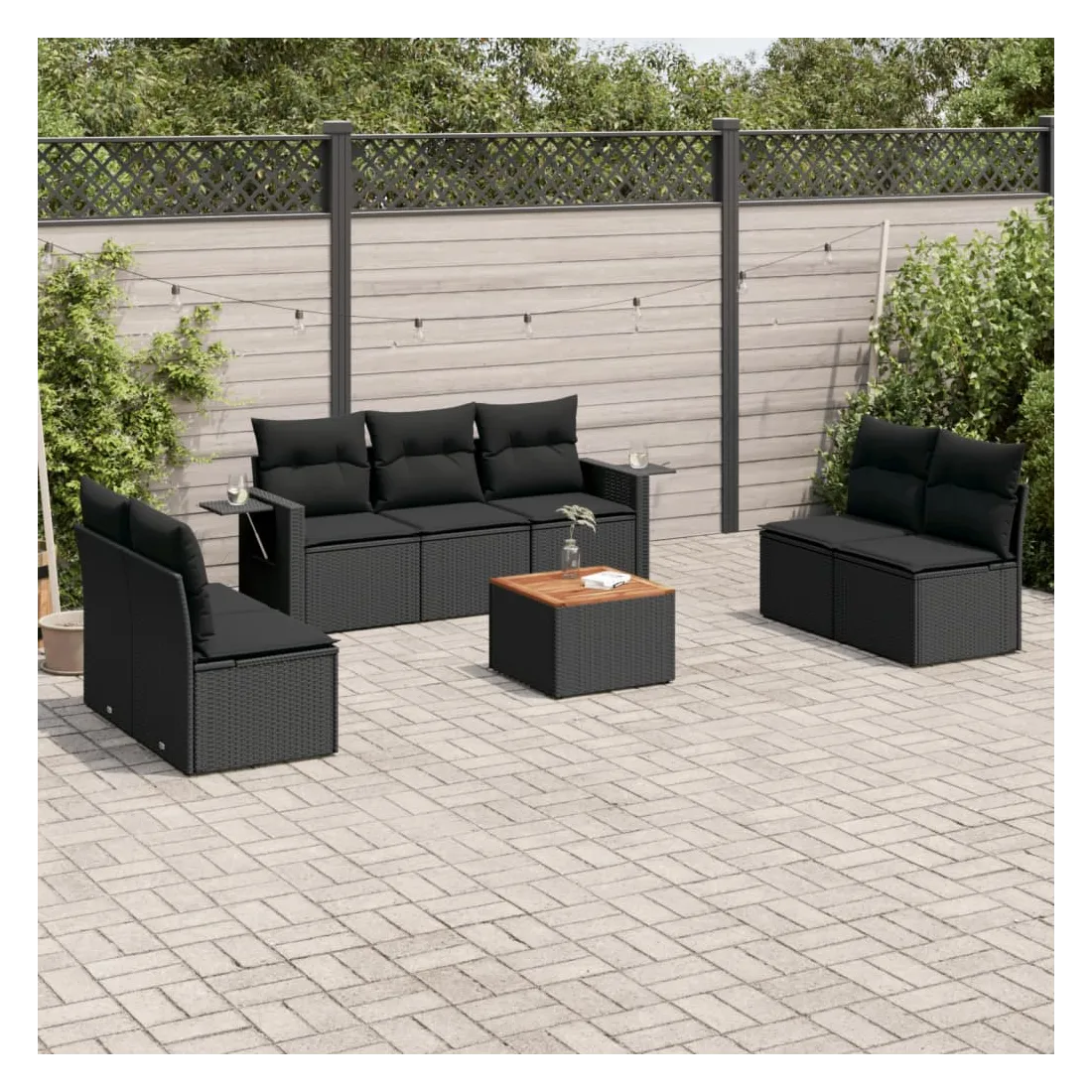 Cet ensemble de canapés de jardin est le complément parfait de votre arrière-cour, terrasse ou patio, offrant un espace confortable et accueillant pour discuter avec la famille et les amis ou simplement se détendre et profiter de l'extérieur. Matériau durable : la résine tressée, également connue sous le nom de poly rotin, est un matériau synthétique solide et nécessitant peu d'entretien qui ressemble au rotin naturel. Il est léger, facile à nettoyer et couramment utilisé pour les meubles d'extérieur en raison de sa durabilité et de ses propriétés de résistance aux intempéries.Fonction de rangement avec sac résistant à l'eau : chaque siège de jardin dispose d'un espace de rangement sous l'assise, complété par un sac résistant à l'eau pour ranger les coussins, les jouets et d'autres objets. Les sacs intérieurs sont dotés d'un couvercle et peuvent être solidement fixés aux sièges à l'aide de bandes auto-agrippantes pour plus de stabilité.Dessus stable et facile à nettoyer : cette table de jardin a un dessus en bois d'acacia robuste, durable et facile à nettoyer avec un chiffon humide.Table d'appoint pratique : ce mobilier d'extérieur comprend des tables d'appoint pliables avec un ressort à gaz sur les accoudoirs, offrant des endroits pratiques pour garder vos essentiels à portée de main.Conception modulaire : cet ensemble de meubles d'extérieur a une conception modulaire, ce qui le rend complètement flexible et facile à déplacer, afin que vous puissiez créer un agencement de meubles d'extérieur personnalisé. Bon à savoir :Pour que vos meubles d'extérieur restent beaux, nous vous recommandons de les protéger avec une housse imperméable.