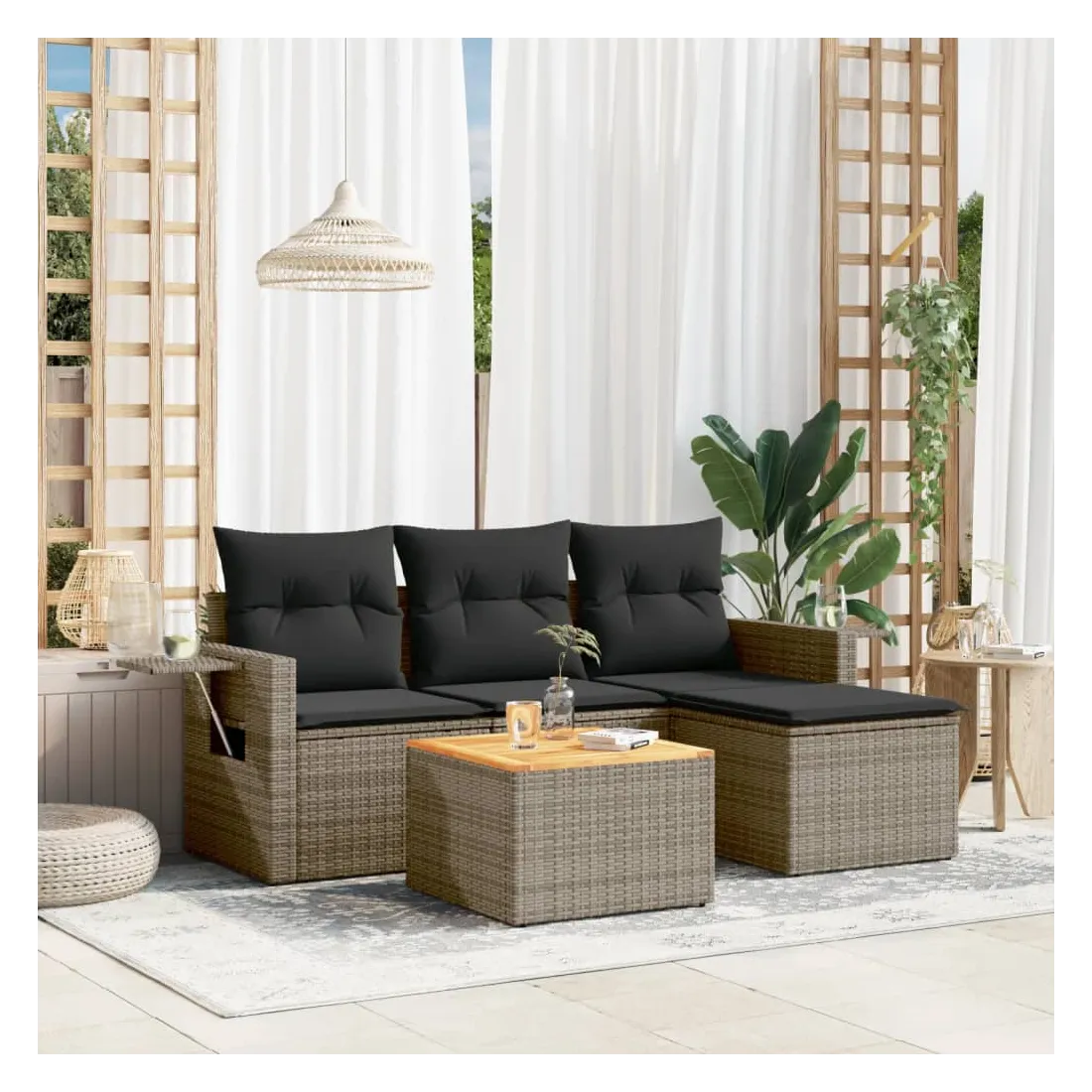 Cet ensemble de canapés de jardin est le complément parfait de votre arrière-cour, terrasse ou patio, offrant un espace confortable et accueillant pour discuter avec la famille et les amis ou simplement se détendre et profiter de l'extérieur. Matériau durable : la résine tressée, également connue sous le nom de poly rotin, est un matériau synthétique solide et nécessitant peu d'entretien qui ressemble au rotin naturel. Il est léger, facile à nettoyer et couramment utilisé pour les meubles d'extérieur en raison de sa durabilité et de ses propriétés de résistance aux intempéries.Fonction de rangement avec sac résistant à l'eau : chaque siège de jardin dispose d'un espace de rangement sous l'assise, complété par un sac résistant à l'eau pour ranger les coussins, les jouets et d'autres objets. Les sacs intérieurs sont dotés d'un couvercle et peuvent être solidement fixés aux sièges à l'aide de bandes auto-agrippantes pour plus de stabilité.Dessus stable et facile à nettoyer : cette table de jardin a un dessus en bois d'acacia robuste, durable et facile à nettoyer avec un chiffon humide.Table d'appoint pratique : ce mobilier d'extérieur comprend des tables d'appoint pliables avec un ressort à gaz sur les accoudoirs, offrant des endroits pratiques pour garder vos essentiels à portée de main.Conception modulaire : cet ensemble de meubles d'extérieur a une conception modulaire, ce qui le rend complètement flexible et facile à déplacer, afin que vous puissiez créer un agencement de meubles d'extérieur personnalisé. Bon à savoir :Pour que vos meubles d'extérieur restent beaux, nous vous recommandons de les protéger avec une housse imperméable.