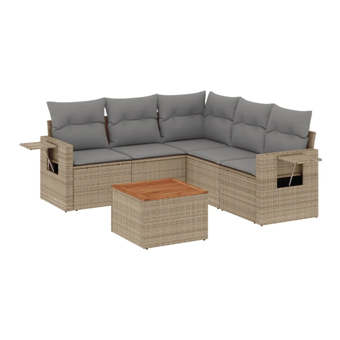 Cet ensemble de canapés de jardin est le complément parfait de votre arrière-cour, terrasse ou patio, offrant un espace confortable et accueillant pour discuter avec la famille et les amis ou simplement se détendre et profiter de l'extérieur. Matériau durable : la résine tressée, également connue sous le nom de poly rotin, est un matériau synthétique solide et nécessitant peu d'entretien qui ressemble au rotin naturel. Il est léger, facile à nettoyer et couramment utilisé pour les meubles d'extérieur en raison de sa durabilité et de ses propriétés de résistance aux intempéries.Fonction de rangement avec sac résistant à l'eau : chaque siège de jardin dispose d'un espace de rangement sous l'assise, complété par un sac résistant à l'eau pour ranger les coussins, les jouets et d'autres objets. Les sacs intérieurs sont dotés d'un couvercle et peuvent être solidement fixés aux sièges à l'aide de bandes auto-agrippantes pour plus de stabilité.Dessus stable et facile à nettoyer : cette table de jardin a un dessus en bois d'acacia robuste, durable et facile à nettoyer avec un chiffon humide.Table d'appoint pratique : ce mobilier d'extérieur comprend des tables d'appoint pliables avec un ressort à gaz sur les accoudoirs, offrant des endroits pratiques pour garder vos essentiels à portée de main.Conception modulaire : cet ensemble de meubles d'extérieur a une conception modulaire, ce qui le rend complètement flexible et facile à déplacer, afin que vous puissiez créer un agencement de meubles d'extérieur personnalisé. Bon à savoir :Pour que vos meubles d'extérieur restent beaux, nous vous recommandons de les protéger avec une housse imperméable.