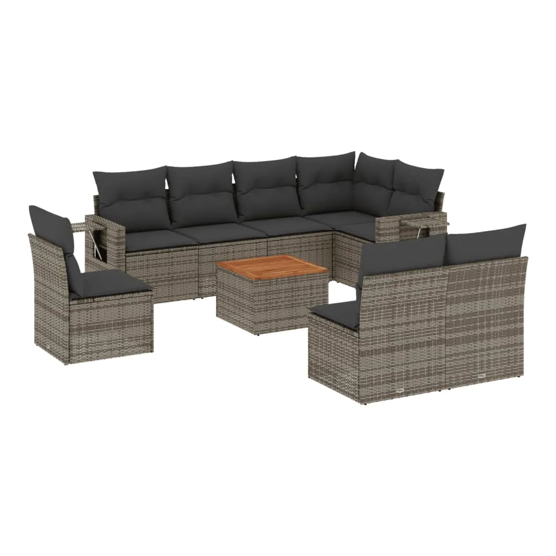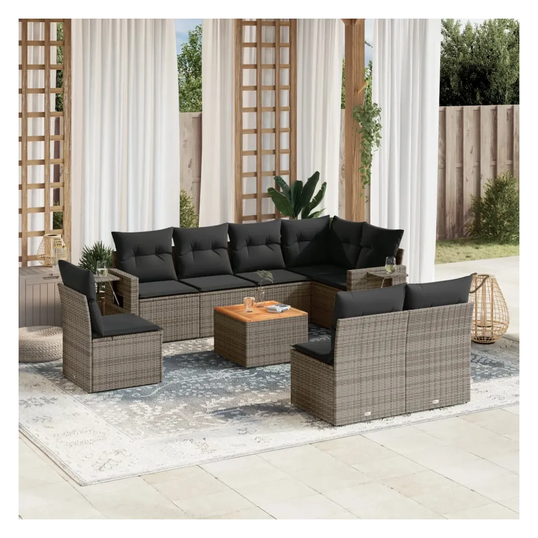 Cet ensemble de canapés de jardin est le complément parfait de votre arrière-cour, terrasse ou patio, offrant un espace confortable et accueillant pour discuter avec la famille et les amis ou simplement se détendre et profiter de l'extérieur. Matériau durable : la résine tressée, également connue sous le nom de poly rotin, est un matériau synthétique solide et nécessitant peu d'entretien qui ressemble au rotin naturel. Il est léger, facile à nettoyer et couramment utilisé pour les meubles d'extérieur en raison de sa durabilité et de ses propriétés de résistance aux intempéries.Fonction de rangement avec sac résistant à l'eau : chaque siège de jardin dispose d'un espace de rangement sous l'assise, complété par un sac résistant à l'eau pour ranger les coussins, les jouets et d'autres objets. Les sacs intérieurs sont dotés d'un couvercle et peuvent être solidement fixés aux sièges à l'aide de bandes auto-agrippantes pour plus de stabilité.Dessus stable et facile à nettoyer : cette table de jardin a un dessus en bois d'acacia robuste, durable et facile à nettoyer avec un chiffon humide.Table d'appoint pratique : ce mobilier d'extérieur comprend des tables d'appoint pliables avec un ressort à gaz sur les accoudoirs, offrant des endroits pratiques pour garder vos essentiels à portée de main.Conception modulaire : cet ensemble de meubles d'extérieur a une conception modulaire, ce qui le rend complètement flexible et facile à déplacer, afin que vous puissiez créer un agencement de meubles d'extérieur personnalisé. Bon à savoir :Pour que vos meubles d'extérieur restent beaux, nous vous recommandons de les protéger avec une housse imperméable.