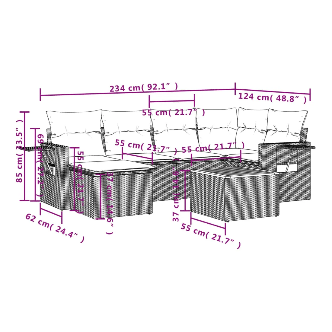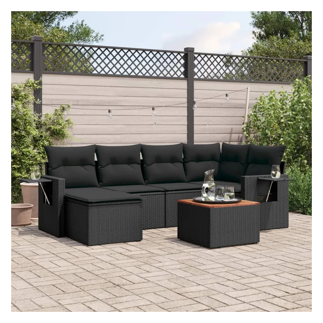 Cet ensemble de canapés de jardin est le complément parfait de votre arrière-cour, terrasse ou patio, offrant un espace confortable et accueillant pour discuter avec la famille et les amis ou simplement se détendre et profiter de l'extérieur. Matériau durable : la résine tressée, également connue sous le nom de poly rotin, est un matériau synthétique solide et nécessitant peu d'entretien qui ressemble au rotin naturel. Il est léger, facile à nettoyer et couramment utilisé pour les meubles d'extérieur en raison de sa durabilité et de ses propriétés de résistance aux intempéries.Fonction de rangement avec sac résistant à l'eau : chaque siège de jardin dispose d'un espace de rangement sous l'assise, complété par un sac résistant à l'eau pour ranger les coussins, les jouets et d'autres objets. Les sacs intérieurs sont dotés d'un couvercle et peuvent être solidement fixés aux sièges à l'aide de bandes auto-agrippantes pour plus de stabilité.Dessus stable et facile à nettoyer : cette table de jardin a un dessus en bois d'acacia robuste, durable et facile à nettoyer avec un chiffon humide.Table d'appoint pratique : ce mobilier d'extérieur comprend des tables d'appoint pliables avec un ressort à gaz sur les accoudoirs, offrant des endroits pratiques pour garder vos essentiels à portée de main.Conception modulaire : cet ensemble de meubles d'extérieur a une conception modulaire, ce qui le rend complètement flexible et facile à déplacer, afin que vous puissiez créer un agencement de meubles d'extérieur personnalisé. Bon à savoir :Pour que vos meubles d'extérieur restent beaux, nous vous recommandons de les protéger avec une housse imperméable.