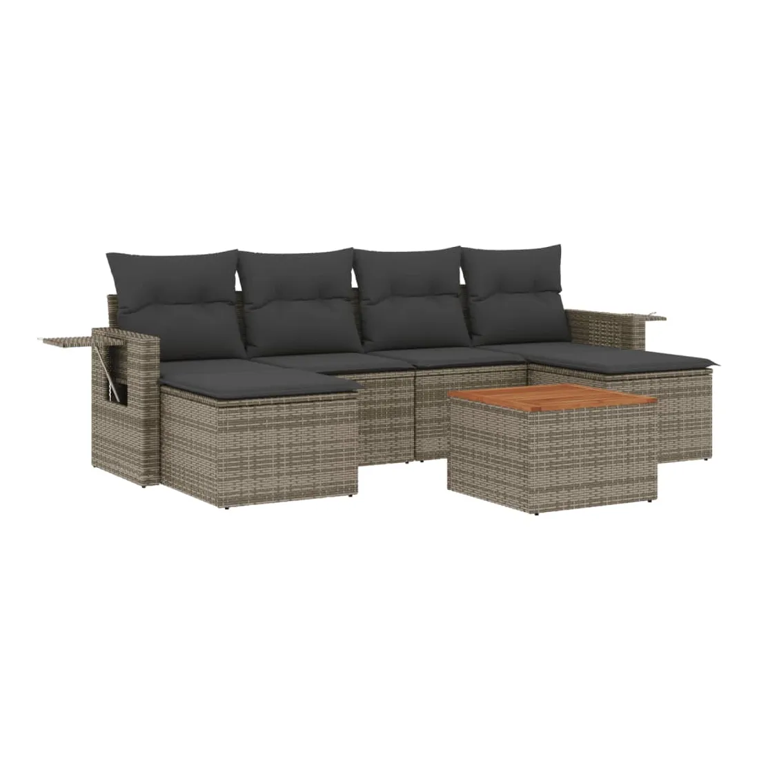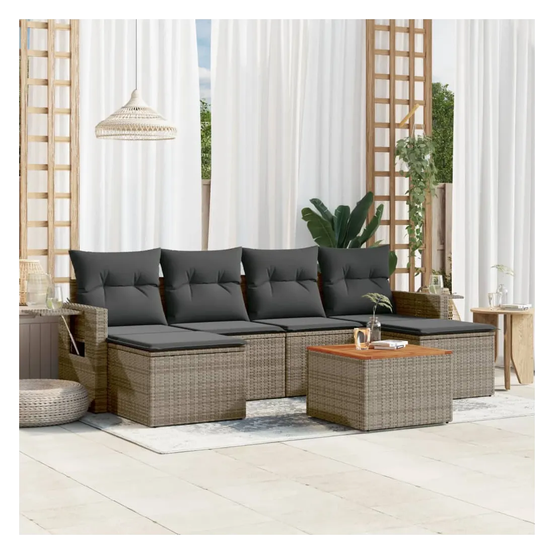 Cet ensemble de canapés de jardin est le complément parfait de votre arrière-cour, terrasse ou patio, offrant un espace confortable et accueillant pour discuter avec la famille et les amis ou simplement se détendre et profiter de l'extérieur. Matériau durable : la résine tressée, également connue sous le nom de poly rotin, est un matériau synthétique solide et nécessitant peu d'entretien qui ressemble au rotin naturel. Il est léger, facile à nettoyer et couramment utilisé pour les meubles d'extérieur en raison de sa durabilité et de ses propriétés de résistance aux intempéries.Fonction de rangement avec sac résistant à l'eau : chaque siège de jardin dispose d'un espace de rangement sous l'assise, complété par un sac résistant à l'eau pour ranger les coussins, les jouets et d'autres objets. Les sacs intérieurs sont dotés d'un couvercle et peuvent être solidement fixés aux sièges à l'aide de bandes auto-agrippantes pour plus de stabilité.Dessus stable et facile à nettoyer : cette table de jardin a un dessus en bois d'acacia robuste, durable et facile à nettoyer avec un chiffon humide.Table d'appoint pratique : ce mobilier d'extérieur comprend des tables d'appoint pliables avec un ressort à gaz sur les accoudoirs, offrant des endroits pratiques pour garder vos essentiels à portée de main.Conception modulaire : cet ensemble de meubles d'extérieur a une conception modulaire, ce qui le rend complètement flexible et facile à déplacer, afin que vous puissiez créer un agencement de meubles d'extérieur personnalisé. Bon à savoir :Pour que vos meubles d'extérieur restent beaux, nous vous recommandons de les protéger avec une housse imperméable.