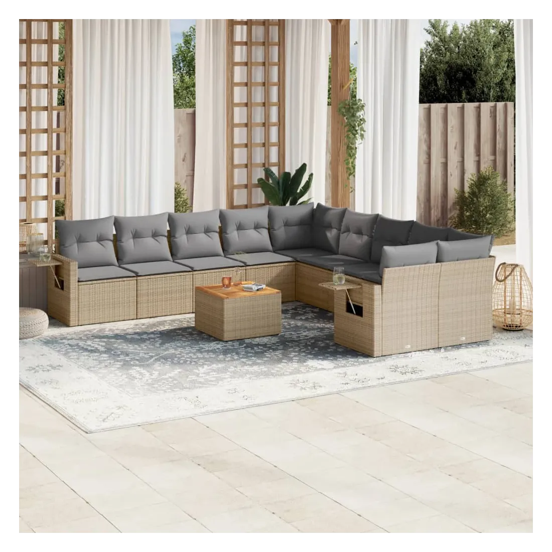 Cet ensemble de canapés de jardin est le complément parfait de votre arrière-cour, terrasse ou patio, offrant un espace confortable et accueillant pour discuter avec la famille et les amis ou simplement se détendre et profiter de l'extérieur. Matériau durable : la résine tressée, également connue sous le nom de poly rotin, est un matériau synthétique solide et nécessitant peu d'entretien qui ressemble au rotin naturel. Il est léger, facile à nettoyer et couramment utilisé pour les meubles d'extérieur en raison de sa durabilité et de ses propriétés de résistance aux intempéries.Fonction de rangement avec sac résistant à l'eau : chaque siège de jardin dispose d'un espace de rangement sous l'assise, complété par un sac résistant à l'eau pour ranger les coussins, les jouets et d'autres objets. Les sacs intérieurs sont dotés d'un couvercle et peuvent être solidement fixés aux sièges à l'aide de bandes auto-agrippantes pour plus de stabilité.Dessus stable et facile à nettoyer : cette table de jardin a un dessus en bois d'acacia robuste, durable et facile à nettoyer avec un chiffon humide.Table d'appoint pratique : ce mobilier d'extérieur comprend des tables d'appoint pliables avec un ressort à gaz sur les accoudoirs, offrant des endroits pratiques pour garder vos essentiels à portée de main.Conception modulaire : cet ensemble de meubles d'extérieur a une conception modulaire, ce qui le rend complètement flexible et facile à déplacer, afin que vous puissiez créer un agencement de meubles d'extérieur personnalisé. Bon à savoir :Pour que vos meubles d'extérieur restent beaux, nous vous recommandons de les protéger avec une housse imperméable.