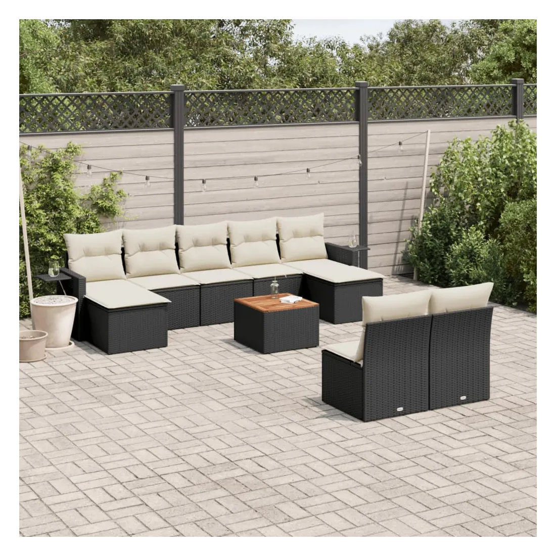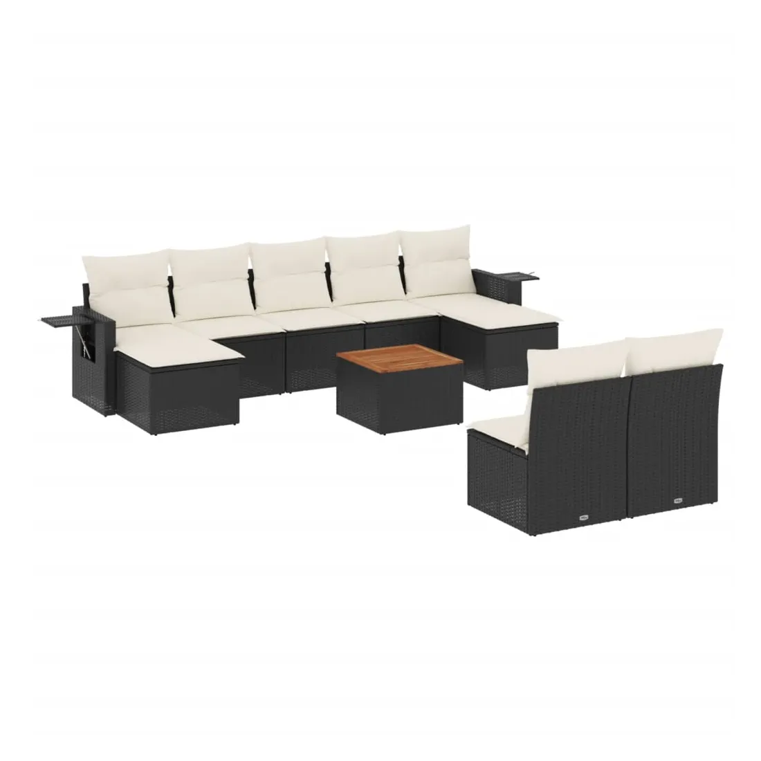 Cet ensemble de canapés de jardin est le complément parfait de votre arrière-cour, terrasse ou patio, offrant un espace confortable et accueillant pour discuter avec la famille et les amis ou simplement se détendre et profiter de l'extérieur. Matériau durable : la résine tressée, également connue sous le nom de poly rotin, est un matériau synthétique solide et nécessitant peu d'entretien qui ressemble au rotin naturel. Il est léger, facile à nettoyer et couramment utilisé pour les meubles d'extérieur en raison de sa durabilité et de ses propriétés de résistance aux intempéries.Fonction de rangement avec sac résistant à l'eau : chaque siège de jardin dispose d'un espace de rangement sous l'assise, complété par un sac résistant à l'eau pour ranger les coussins, les jouets et d'autres objets. Les sacs intérieurs sont dotés d'un couvercle et peuvent être solidement fixés aux sièges à l'aide de bandes auto-agrippantes pour plus de stabilité.Dessus stable et facile à nettoyer : cette table de jardin a un dessus en bois d'acacia robuste, durable et facile à nettoyer avec un chiffon humide.Table d'appoint pratique : ce mobilier d'extérieur comprend des tables d'appoint pliables avec un ressort à gaz sur les accoudoirs, offrant des endroits pratiques pour garder vos essentiels à portée de main.Conception modulaire : cet ensemble de meubles d'extérieur a une conception modulaire, ce qui le rend complètement flexible et facile à déplacer, afin que vous puissiez créer un agencement de meubles d'extérieur personnalisé. Bon à savoir :Pour que vos meubles d'extérieur restent beaux, nous vous recommandons de les protéger avec une housse imperméable.