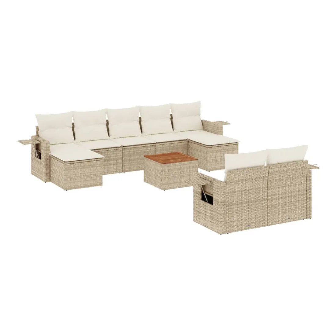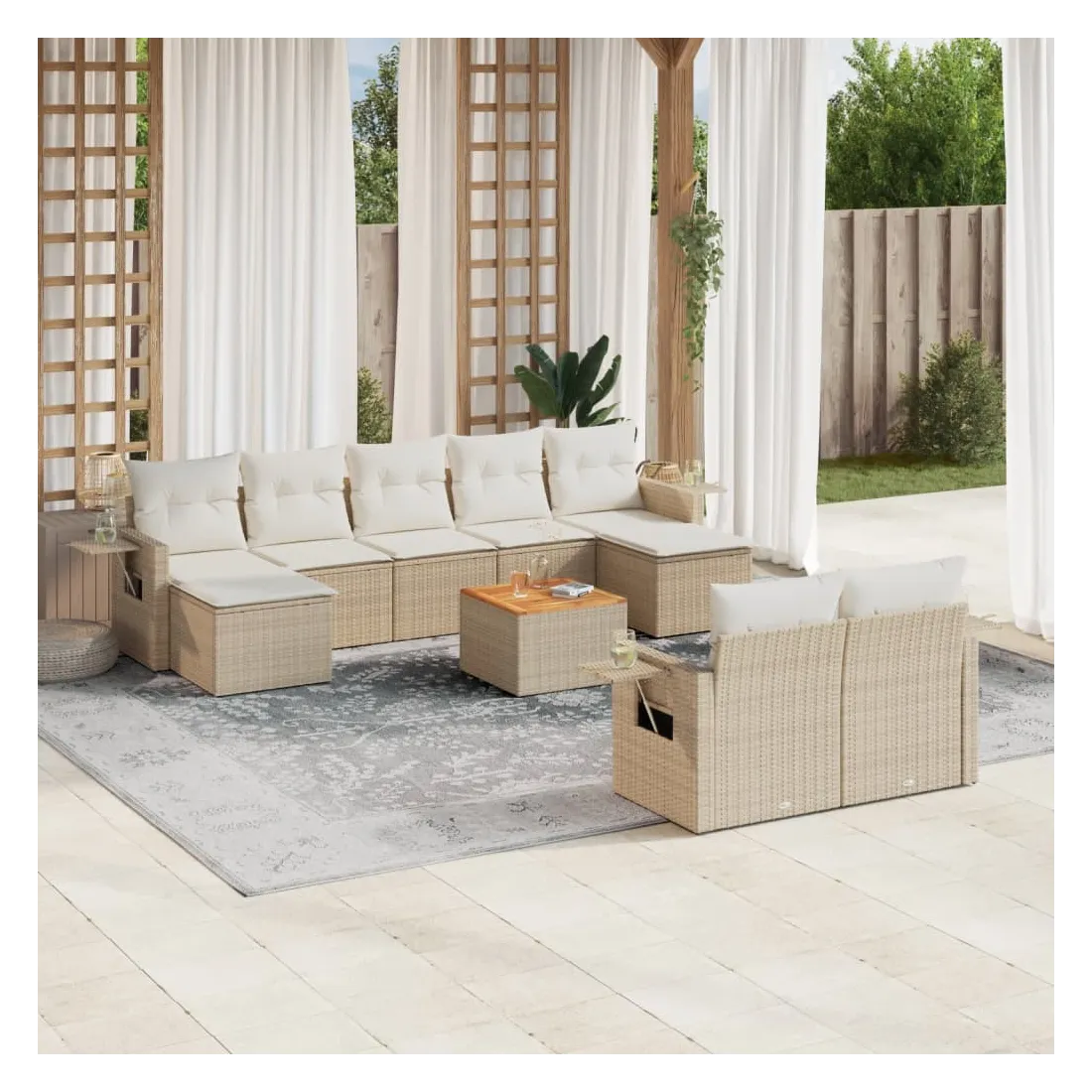 Cet ensemble de canapés de jardin est le complément parfait de votre arrière-cour, terrasse ou patio, offrant un espace confortable et accueillant pour discuter avec la famille et les amis ou simplement se détendre et profiter de l'extérieur. Matériau durable : la résine tressée, également connue sous le nom de poly rotin, est un matériau synthétique solide et nécessitant peu d'entretien qui ressemble au rotin naturel. Il est léger, facile à nettoyer et couramment utilisé pour les meubles d'extérieur en raison de sa durabilité et de ses propriétés de résistance aux intempéries.Fonction de rangement avec sac résistant à l'eau : chaque siège de jardin dispose d'un espace de rangement sous l'assise, complété par un sac résistant à l'eau pour ranger les coussins, les jouets et d'autres objets. Les sacs intérieurs sont dotés d'un couvercle et peuvent être solidement fixés aux sièges à l'aide de bandes auto-agrippantes pour plus de stabilité.Dessus stable et facile à nettoyer : cette table de jardin a un dessus en bois d'acacia robuste, durable et facile à nettoyer avec un chiffon humide.Table d'appoint pratique : ce mobilier d'extérieur comprend des tables d'appoint pliables avec un ressort à gaz sur les accoudoirs, offrant des endroits pratiques pour garder vos essentiels à portée de main.Conception modulaire : cet ensemble de meubles d'extérieur a une conception modulaire, ce qui le rend complètement flexible et facile à déplacer, afin que vous puissiez créer un agencement de meubles d'extérieur personnalisé. Bon à savoir :Pour que vos meubles d'extérieur restent beaux, nous vous recommandons de les protéger avec une housse imperméable.