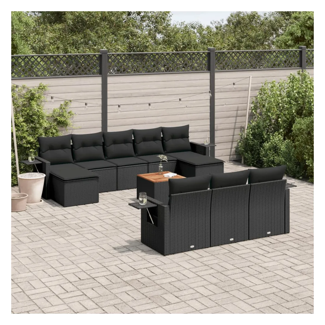 Cet ensemble de canapés de jardin est le complément parfait de votre arrière-cour, terrasse ou patio, offrant un espace confortable et accueillant pour discuter avec la famille et les amis ou simplement se détendre et profiter de l'extérieur. Matériau durable : la résine tressée, également connue sous le nom de poly rotin, est un matériau synthétique solide et nécessitant peu d'entretien qui ressemble au rotin naturel. Il est léger, facile à nettoyer et couramment utilisé pour les meubles d'extérieur en raison de sa durabilité et de ses propriétés de résistance aux intempéries.Fonction de rangement avec sac résistant à l'eau : chaque siège de jardin dispose d'un espace de rangement sous l'assise, complété par un sac résistant à l'eau pour ranger les coussins, les jouets et d'autres objets. Les sacs intérieurs sont dotés d'un couvercle et peuvent être solidement fixés aux sièges à l'aide de bandes auto-agrippantes pour plus de stabilité.Dessus stable et facile à nettoyer : cette table de jardin a un dessus en bois d'acacia robuste, durable et facile à nettoyer avec un chiffon humide.Table d'appoint pratique : ce mobilier d'extérieur comprend des tables d'appoint pliables avec un ressort à gaz sur les accoudoirs, offrant des endroits pratiques pour garder vos essentiels à portée de main.Conception modulaire : cet ensemble de meubles d'extérieur a une conception modulaire, ce qui le rend complètement flexible et facile à déplacer, afin que vous puissiez créer un agencement de meubles d'extérieur personnalisé. Bon à savoir :Pour que vos meubles d'extérieur restent beaux, nous vous recommandons de les protéger avec une housse imperméable.