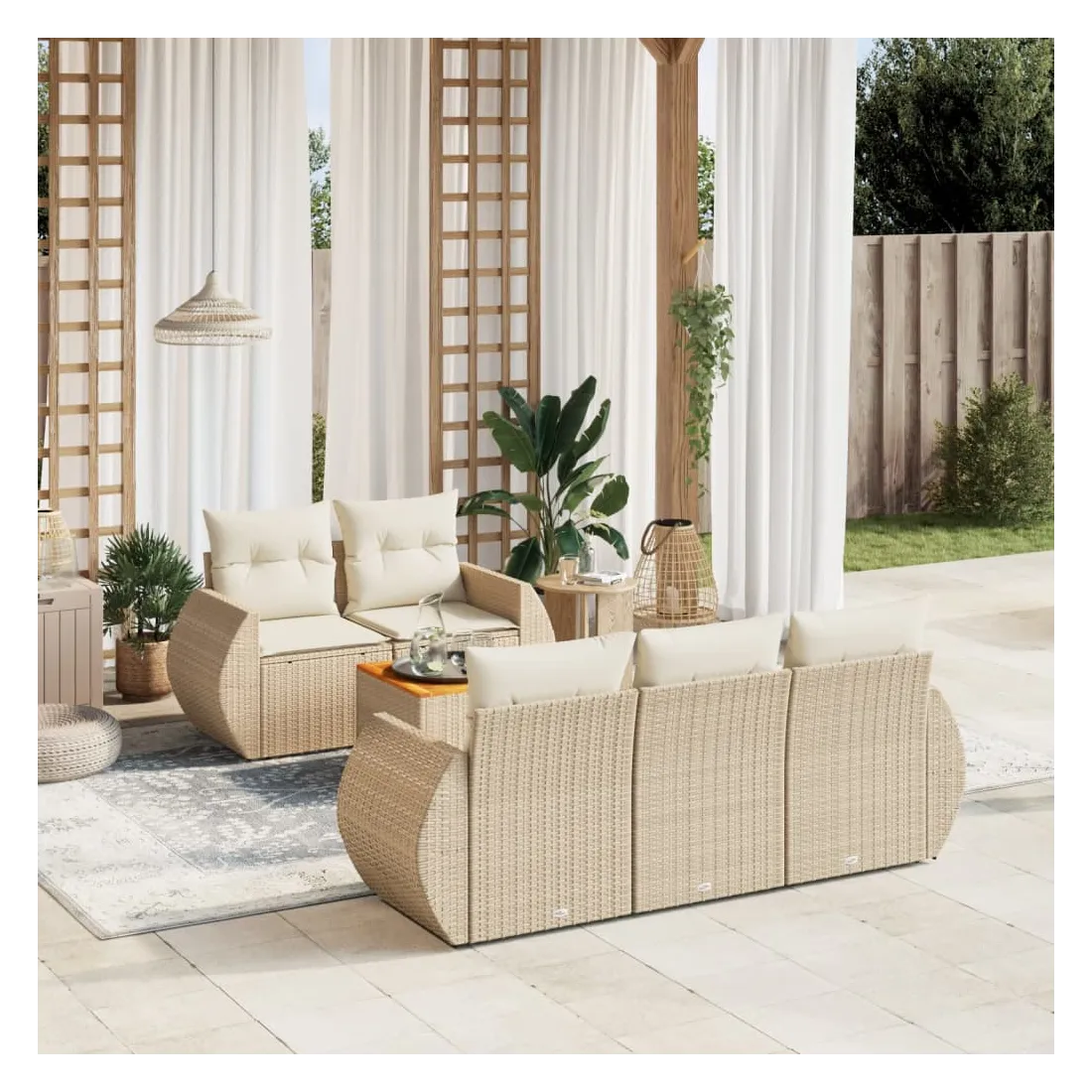 Cet ensemble de canapés de jardin est le complément parfait de votre arrière-cour, terrasse ou patio, offrant un espace confortable et accueillant pour discuter avec la famille et les amis ou simplement se détendre et profiter de l'extérieur. Matériau durable : la résine tressée, également connue sous le nom de poly rotin, est un matériau synthétique solide et nécessitant peu d'entretien qui ressemble au rotin naturel. Il est léger, facile à nettoyer et couramment utilisé pour les meubles d'extérieur en raison de sa durabilité et de ses propriétés de résistance aux intempéries.Dessus stable et facile à nettoyer : cette table de jardin a un dessus en bois d'acacia robuste, durable et facile à nettoyer avec un chiffon humide. Fonction de rangement avec sac résistant à l'eau : chaque siège de jardin dispose d'un espace de rangement sous l'assise, complété par un sac résistant à l'eau pour ranger les coussins, les jouets et d'autres objets. Les sacs intérieurs sont dotés d'un couvercle et peuvent être solidement fixés aux sièges à l'aide de bandes auto-agrippantes pour plus de stabilité.Expérience d'assise confortable : ce mobilier d'extérieur, doté de coussins épais, offre une expérience d'assise confortable.Conception modulaire : cet ensemble de meubles d'extérieur a une conception modulaire, ce qui le rend complètement flexible et facile à déplacer, afin que vous puissiez créer un agencement de meubles d'extérieur personnalisé. Bon à savoir :Pour que vos meubles d'extérieur restent beaux, nous vous recommandons de les protéger avec une housse imperméable.