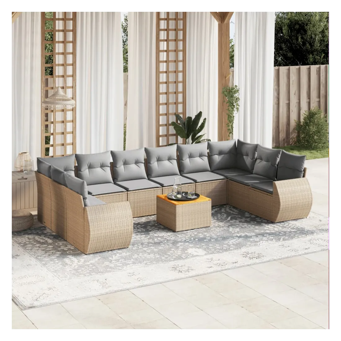 Cet ensemble de canapés de jardin est le complément parfait de votre arrière-cour, terrasse ou patio, offrant un espace confortable et accueillant pour discuter avec la famille et les amis ou simplement se détendre et profiter de l'extérieur. Matériau durable : la résine tressée, également connue sous le nom de poly rotin, est un matériau synthétique solide et nécessitant peu d'entretien qui ressemble au rotin naturel. Il est léger, facile à nettoyer et couramment utilisé pour les meubles d'extérieur en raison de sa durabilité et de ses propriétés de résistance aux intempéries.Dessus stable et facile à nettoyer : cette table de jardin a un dessus en bois d'acacia robuste, durable et facile à nettoyer avec un chiffon humide. Fonction de rangement avec sac résistant à l'eau : chaque siège de jardin dispose d'un espace de rangement sous l'assise, complété par un sac résistant à l'eau pour ranger les coussins, les jouets et d'autres objets. Les sacs intérieurs sont dotés d'un couvercle et peuvent être solidement fixés aux sièges à l'aide de bandes auto-agrippantes pour plus de stabilité.Expérience d'assise confortable : ce mobilier d'extérieur, doté de coussins épais, offre une expérience d'assise confortable.Conception modulaire : cet ensemble de meubles d'extérieur a une conception modulaire, ce qui le rend complètement flexible et facile à déplacer, afin que vous puissiez créer un agencement de meubles d'extérieur personnalisé. Bon à savoir :Pour que vos meubles d'extérieur restent beaux, nous vous recommandons de les protéger avec une housse imperméable.