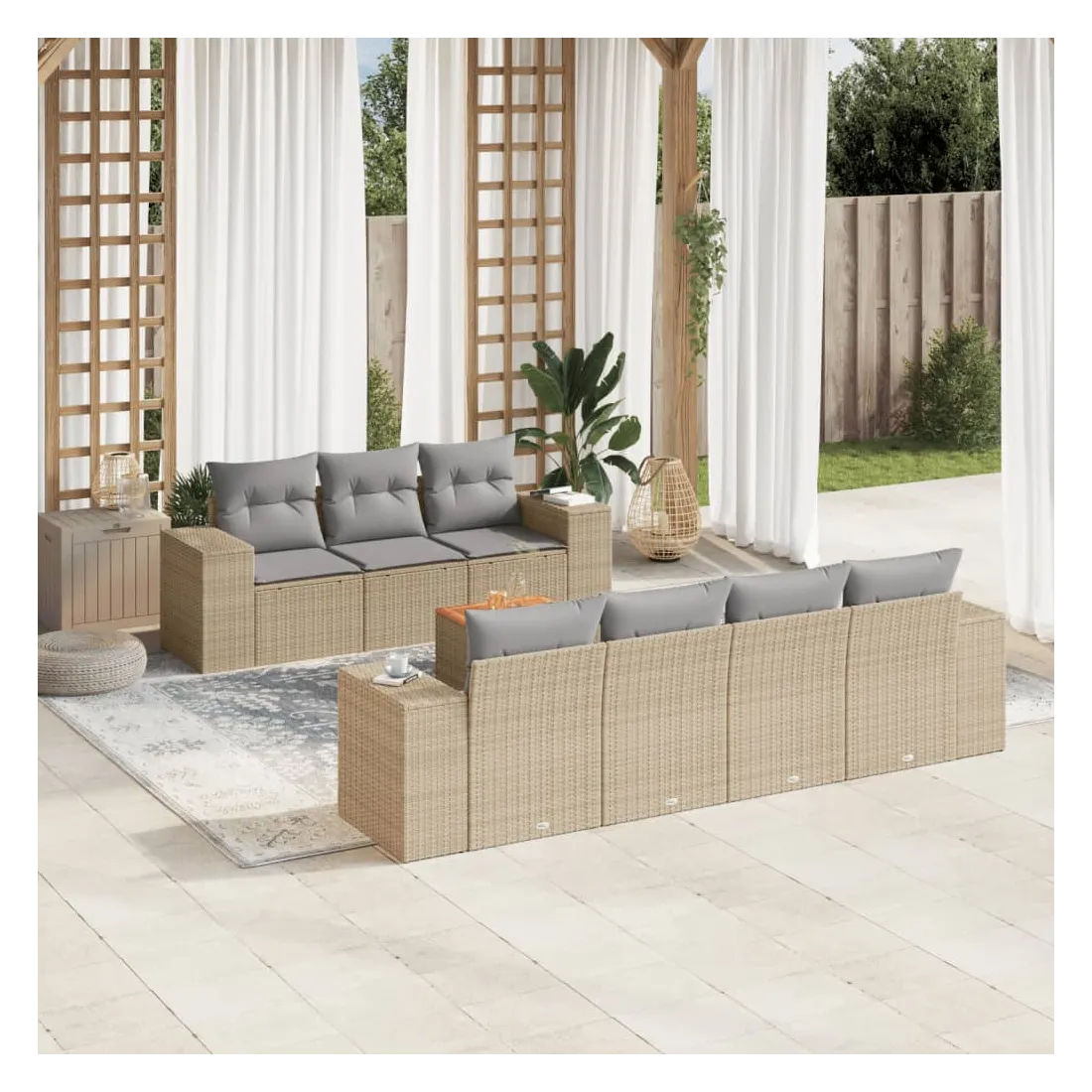 Cet ensemble de canapés de jardin est le complément parfait de votre arrière-cour, terrasse ou patio, offrant un espace confortable et accueillant pour discuter avec la famille et les amis ou simplement se détendre et profiter de l'extérieur. Matériau durable : la résine tressée, également connue sous le nom de poly rotin, est un matériau synthétique solide et nécessitant peu d'entretien qui ressemble au rotin naturel. Il est léger, facile à nettoyer et couramment utilisé pour les meubles d'extérieur en raison de sa durabilité et de ses propriétés de résistance aux intempéries. Fonction de rangement avec sac résistant à l'eau : chaque siège de jardin dispose d'un espace de rangement sous l'assise, complété par un sac résistant à l'eau pour ranger les coussins, les jouets et d'autres objets. Les sacs intérieurs sont dotés d'un couvercle et peuvent être solidement fixés aux sièges à l'aide de bandes auto-agrippantes pour plus de stabilité. Dessus stable et facile à nettoyer : cette table de jardin a un dessus en bois d'acacia robuste, durable et facile à nettoyer avec un chiffon humide. Expérience d'assise confortable : ce mobilier d'extérieur, doté de coussins épais, offre une expérience d'assise confortable. Conception modulaire : cet ensemble de meubles d'extérieur a une conception modulaire, ce qui le rend complètement flexible et facile à déplacer, afin que vous puissiez créer un agencement de meubles d'extérieur personnalisé. Bon à savoir :Pour que vos meubles d'extérieur restent beaux, nous vous recommandons de les protéger avec une housse imperméable.