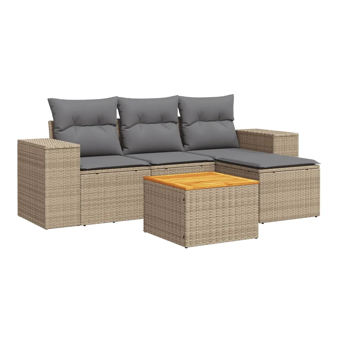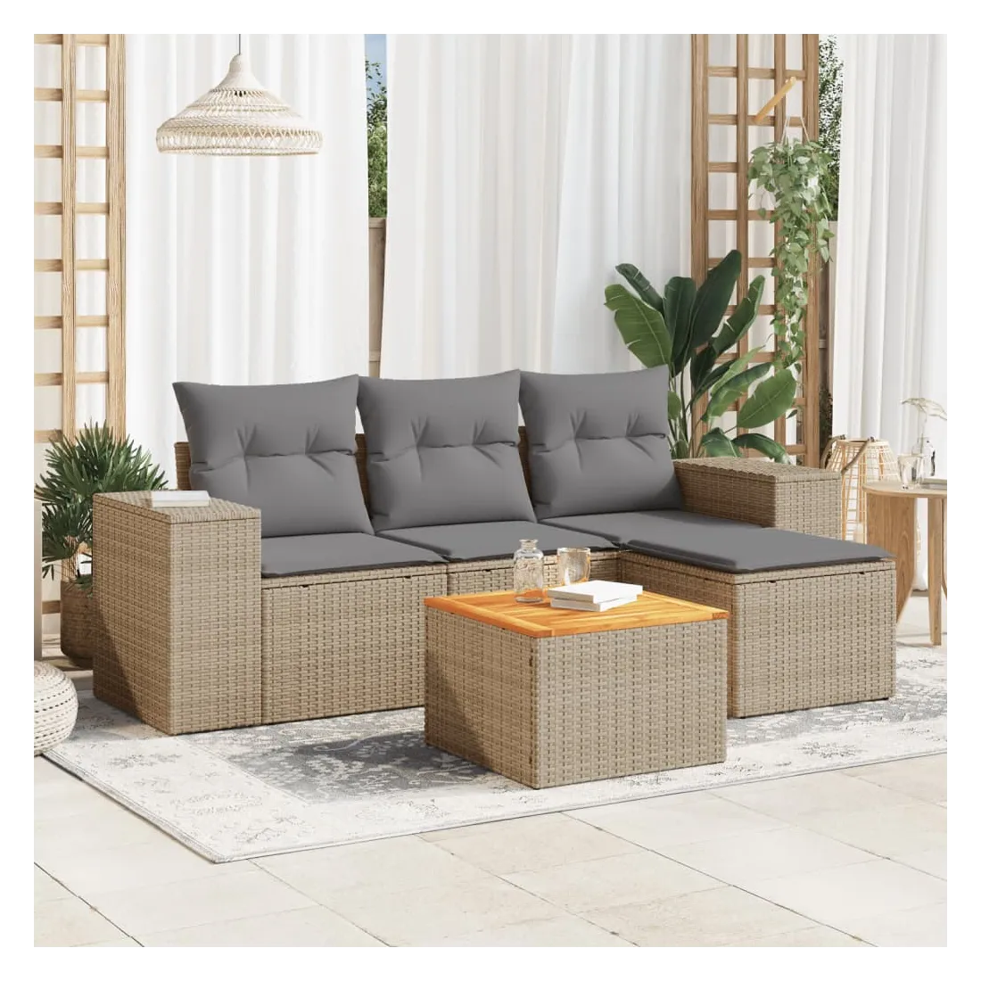 Cet ensemble de canapés de jardin est le complément parfait de votre arrière-cour, terrasse ou patio, offrant un espace confortable et accueillant pour discuter avec la famille et les amis ou simplement se détendre et profiter de l'extérieur. Matériau durable : la résine tressée, également connue sous le nom de poly rotin, est un matériau synthétique solide et nécessitant peu d'entretien qui ressemble au rotin naturel. Il est léger, facile à nettoyer et couramment utilisé pour les meubles d'extérieur en raison de sa durabilité et de ses propriétés de résistance aux intempéries. Fonction de rangement avec sac résistant à l'eau : chaque siège de jardin dispose d'un espace de rangement sous l'assise, complété par un sac résistant à l'eau pour ranger les coussins, les jouets et d'autres objets. Les sacs intérieurs sont dotés d'un couvercle et peuvent être solidement fixés aux sièges à l'aide de bandes auto-agrippantes pour plus de stabilité. Dessus stable et facile à nettoyer : cette table de jardin a un dessus en bois d'acacia robuste, durable et facile à nettoyer avec un chiffon humide. Expérience d'assise confortable : ce mobilier d'extérieur, doté de coussins épais, offre une expérience d'assise confortable. Conception modulaire : cet ensemble de meubles d'extérieur a une conception modulaire, ce qui le rend complètement flexible et facile à déplacer, afin que vous puissiez créer un agencement de meubles d'extérieur personnalisé. Bon à savoir :Pour que vos meubles d'extérieur restent beaux, nous vous recommandons de les protéger avec une housse imperméable.