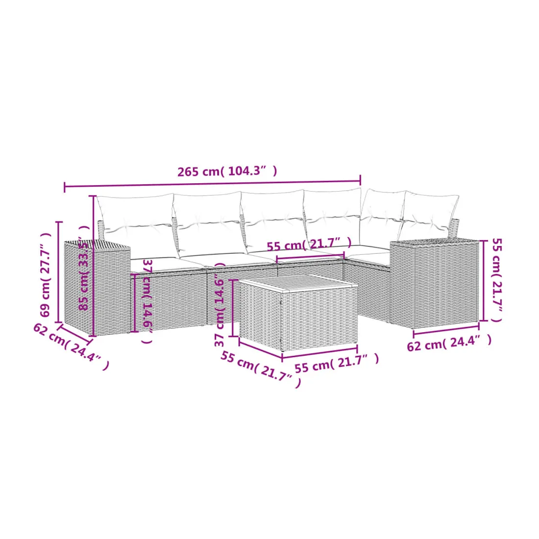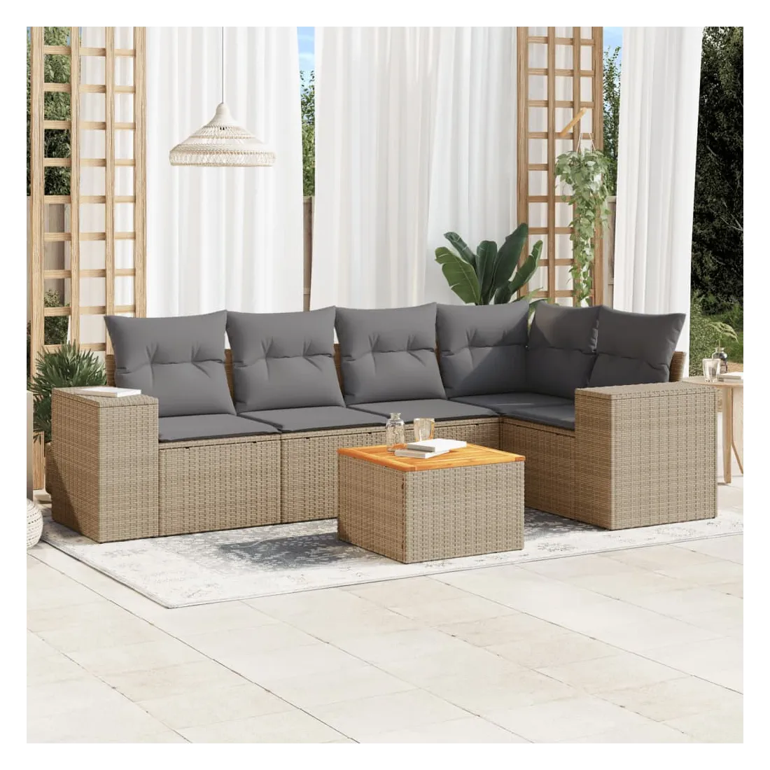 Cet ensemble de canapés de jardin est le complément parfait de votre arrière-cour, terrasse ou patio, offrant un espace confortable et accueillant pour discuter avec la famille et les amis ou simplement se détendre et profiter de l'extérieur. Matériau durable : la résine tressée, également connue sous le nom de poly rotin, est un matériau synthétique solide et nécessitant peu d'entretien qui ressemble au rotin naturel. Il est léger, facile à nettoyer et couramment utilisé pour les meubles d'extérieur en raison de sa durabilité et de ses propriétés de résistance aux intempéries.Dessus stable et facile à nettoyer : cette table de jardin a un dessus en bois d'acacia robuste, durable et facile à nettoyer avec un chiffon humide. Fonction de rangement avec sac résistant à l'eau : chaque siège de jardin dispose d'un espace de rangement sous l'assise, complété par un sac résistant à l'eau pour ranger les coussins, les jouets et d'autres objets. Les sacs intérieurs sont dotés d'un couvercle et peuvent être solidement fixés aux sièges à l'aide de bandes auto-agrippantes pour plus de stabilité.Expérience d'assise confortable : ce mobilier d'extérieur, doté de coussins épais, offre une expérience d'assise confortable.Conception modulaire : cet ensemble de meubles d'extérieur a une conception modulaire, ce qui le rend complètement flexible et facile à déplacer, afin que vous puissiez créer un agencement de meubles d'extérieur personnalisé. Bon à savoir :Pour que vos meubles d'extérieur restent beaux, nous vous recommandons de les protéger avec une housse imperméable.