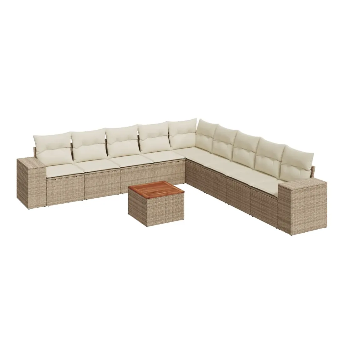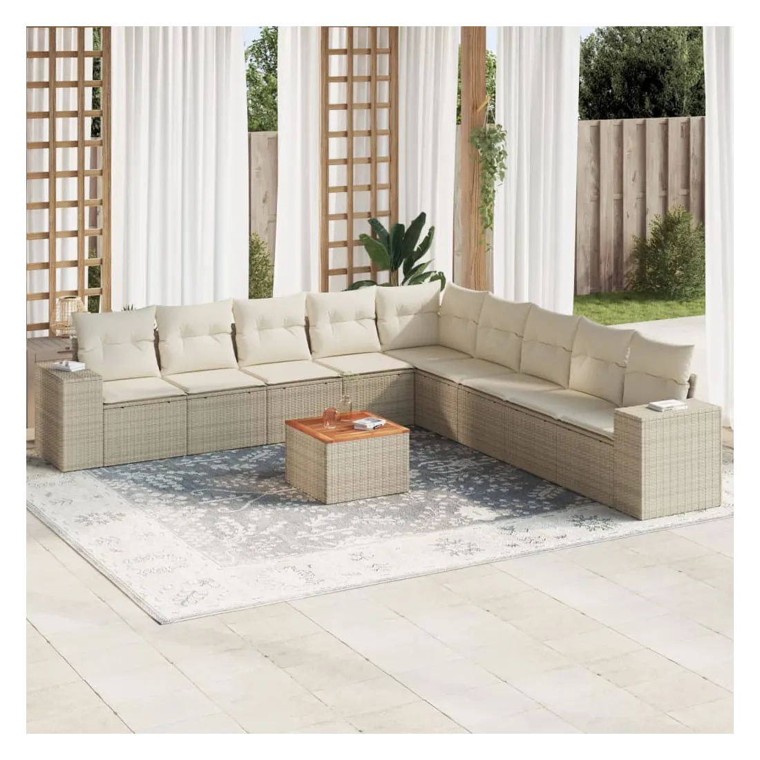 Cet ensemble de canapés de jardin est le complément parfait de votre arrière-cour, terrasse ou patio, offrant un espace confortable et accueillant pour discuter avec la famille et les amis ou simplement se détendre et profiter de l'extérieur. Matériau durable : la résine tressée, également connue sous le nom de poly rotin, est un matériau synthétique solide et nécessitant peu d'entretien qui ressemble au rotin naturel. Il est léger, facile à nettoyer et couramment utilisé pour les meubles d'extérieur en raison de sa durabilité et de ses propriétés de résistance aux intempéries. Fonction de rangement avec sac résistant à l'eau : chaque siège de jardin dispose d'un espace de rangement sous l'assise, complété par un sac résistant à l'eau pour ranger les coussins, les jouets et d'autres objets. Les sacs intérieurs sont dotés d'un couvercle et peuvent être solidement fixés aux sièges à l'aide de bandes auto-agrippantes pour plus de stabilité. Dessus stable et facile à nettoyer : cette table de jardin a un dessus en bois d'acacia robuste, durable et facile à nettoyer avec un chiffon humide. Expérience d'assise confortable : ce mobilier d'extérieur, doté de coussins épais, offre une expérience d'assise confortable. Conception modulaire : cet ensemble de meubles d'extérieur a une conception modulaire, ce qui le rend complètement flexible et facile à déplacer, afin que vous puissiez créer un agencement de meubles d'extérieur personnalisé. Bon à savoir :Pour que vos meubles d'extérieur restent beaux, nous vous recommandons de les protéger avec une housse imperméable.