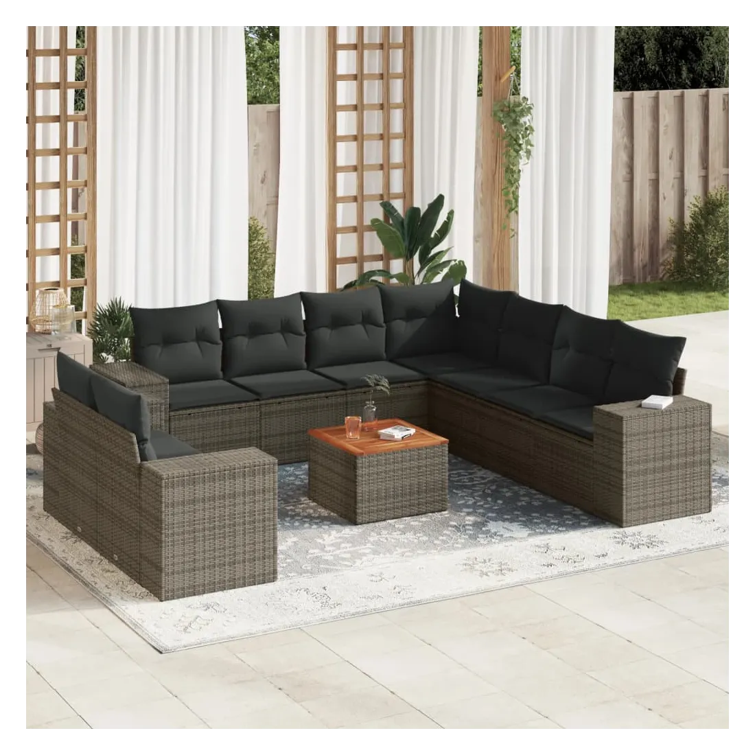 Cet ensemble de canapés de jardin est le complément parfait de votre arrière-cour, terrasse ou patio, offrant un espace confortable et accueillant pour discuter avec la famille et les amis ou simplement se détendre et profiter de l'extérieur. Matériau durable : la résine tressée, également connue sous le nom de poly rotin, est un matériau synthétique solide et nécessitant peu d'entretien qui ressemble au rotin naturel. Il est léger, facile à nettoyer et couramment utilisé pour les meubles d'extérieur en raison de sa durabilité et de ses propriétés de résistance aux intempéries. Fonction de rangement avec sac résistant à l'eau : chaque siège de jardin dispose d'un espace de rangement sous l'assise, complété par un sac résistant à l'eau pour ranger les coussins, les jouets et d'autres objets. Les sacs intérieurs sont dotés d'un couvercle et peuvent être solidement fixés aux sièges à l'aide de bandes auto-agrippantes pour plus de stabilité. Dessus stable et facile à nettoyer : cette table de jardin a un dessus en bois d'acacia robuste, durable et facile à nettoyer avec un chiffon humide. Expérience d'assise confortable : ce mobilier d'extérieur, doté de coussins épais, offre une expérience d'assise confortable. Conception modulaire : cet ensemble de meubles d'extérieur a une conception modulaire, ce qui le rend complètement flexible et facile à déplacer, afin que vous puissiez créer un agencement de meubles d'extérieur personnalisé. Bon à savoir :Pour que vos meubles d'extérieur restent beaux, nous vous recommandons de les protéger avec une housse imperméable.