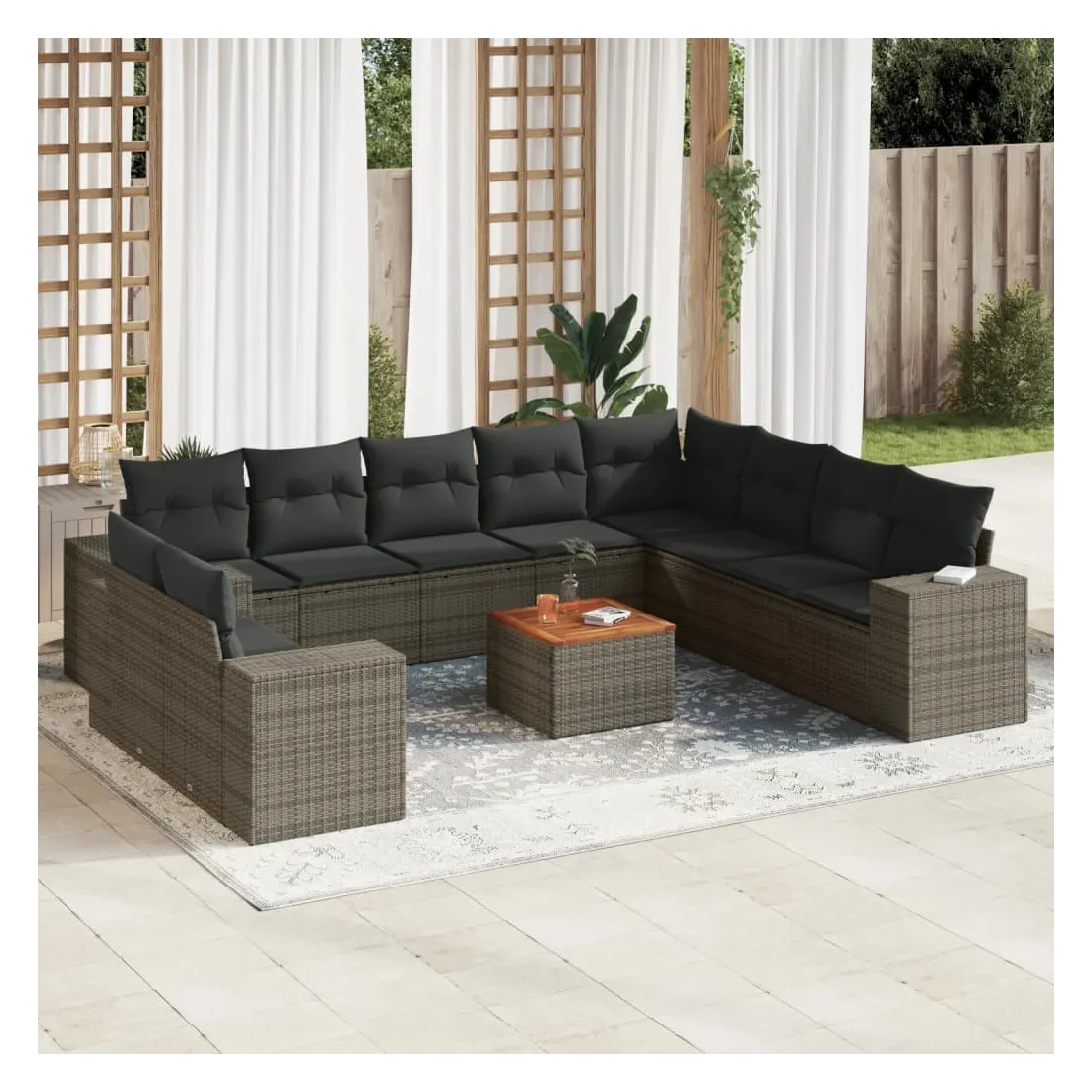 Cet ensemble de canapés de jardin est le complément parfait de votre arrière-cour, terrasse ou patio, offrant un espace confortable et accueillant pour discuter avec la famille et les amis ou simplement se détendre et profiter de l'extérieur. Matériau durable : la résine tressée, également connue sous le nom de poly rotin, est un matériau synthétique solide et nécessitant peu d'entretien qui ressemble au rotin naturel. Il est léger, facile à nettoyer et couramment utilisé pour les meubles d'extérieur en raison de sa durabilité et de ses propriétés de résistance aux intempéries. Fonction de rangement avec sac résistant à l'eau : chaque siège de jardin dispose d'un espace de rangement sous l'assise, complété par un sac résistant à l'eau pour ranger les coussins, les jouets et d'autres objets. Les sacs intérieurs sont dotés d'un couvercle et peuvent être solidement fixés aux sièges à l'aide de bandes auto-agrippantes pour plus de stabilité. Dessus stable et facile à nettoyer : cette table de jardin a un dessus en bois d'acacia robuste, durable et facile à nettoyer avec un chiffon humide. Expérience d'assise confortable : ce mobilier d'extérieur, doté de coussins épais, offre une expérience d'assise confortable. Conception modulaire : cet ensemble de meubles d'extérieur a une conception modulaire, ce qui le rend complètement flexible et facile à déplacer, afin que vous puissiez créer un agencement de meubles d'extérieur personnalisé. Bon à savoir :Pour que vos meubles d'extérieur restent beaux, nous vous recommandons de les protéger avec une housse imperméable.