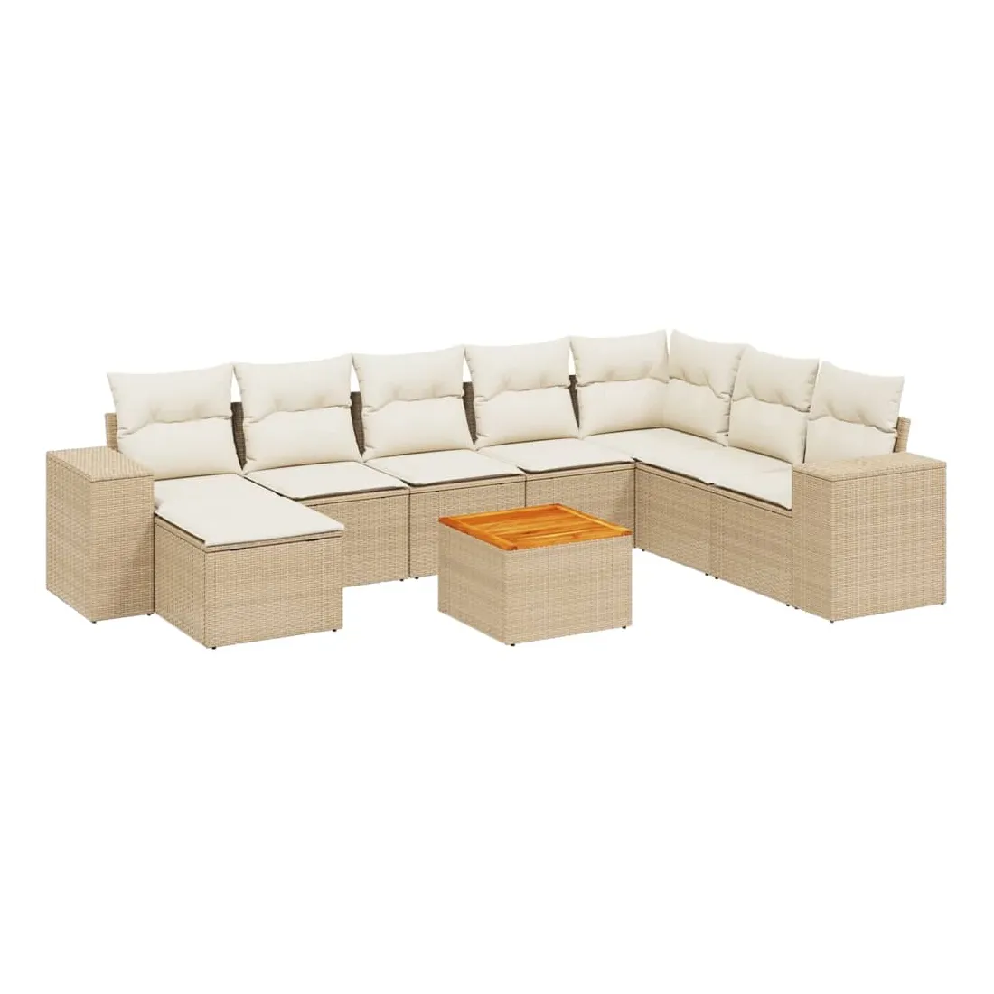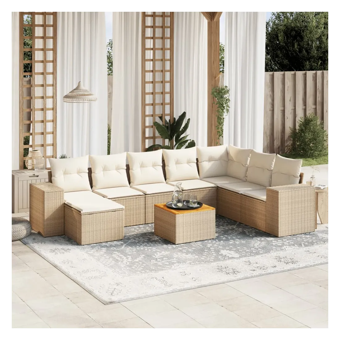Cet ensemble de canapés de jardin est le complément parfait de votre arrière-cour, terrasse ou patio, offrant un espace confortable et accueillant pour discuter avec la famille et les amis ou simplement se détendre et profiter de l'extérieur. Matériau durable : la résine tressée, également connue sous le nom de poly rotin, est un matériau synthétique solide et nécessitant peu d'entretien qui ressemble au rotin naturel. Il est léger, facile à nettoyer et couramment utilisé pour les meubles d'extérieur en raison de sa durabilité et de ses propriétés de résistance aux intempéries.Dessus stable et facile à nettoyer : cette table de jardin a un dessus en bois d'acacia robuste, durable et facile à nettoyer avec un chiffon humide. Fonction de rangement avec sac résistant à l'eau : chaque siège de jardin dispose d'un espace de rangement sous l'assise, complété par un sac résistant à l'eau pour ranger les coussins, les jouets et d'autres objets. Les sacs intérieurs sont dotés d'un couvercle et peuvent être solidement fixés aux sièges à l'aide de bandes auto-agrippantes pour plus de stabilité.Expérience d'assise confortable : ce mobilier d'extérieur, doté de coussins épais, offre une expérience d'assise confortable.Conception modulaire : cet ensemble de meubles d'extérieur a une conception modulaire, ce qui le rend complètement flexible et facile à déplacer, afin que vous puissiez créer un agencement de meubles d'extérieur personnalisé. Bon à savoir :Pour que vos meubles d'extérieur restent beaux, nous vous recommandons de les protéger avec une housse imperméable.