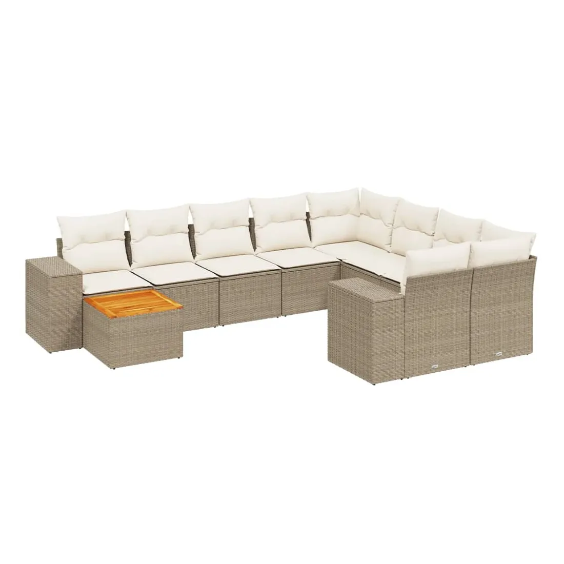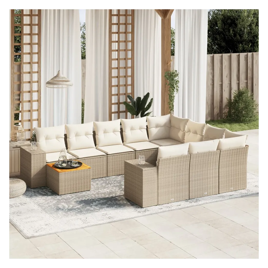 Cet ensemble de canapés de jardin est le complément parfait de votre arrière-cour, terrasse ou patio, offrant un espace confortable et accueillant pour discuter avec la famille et les amis ou simplement se détendre et profiter de l'extérieur. Matériau durable : la résine tressée, également connue sous le nom de poly rotin, est un matériau synthétique solide et nécessitant peu d'entretien qui ressemble au rotin naturel. Il est léger, facile à nettoyer et couramment utilisé pour les meubles d'extérieur en raison de sa durabilité et de ses propriétés de résistance aux intempéries.Dessus stable et facile à nettoyer : cette table de jardin a un dessus en bois d'acacia robuste, durable et facile à nettoyer avec un chiffon humide. Fonction de rangement avec sac résistant à l'eau : chaque siège de jardin dispose d'un espace de rangement sous l'assise, complété par un sac résistant à l'eau pour ranger les coussins, les jouets et d'autres objets. Les sacs intérieurs sont dotés d'un couvercle et peuvent être solidement fixés aux sièges à l'aide de bandes auto-agrippantes pour plus de stabilité.Expérience d'assise confortable : ce mobilier d'extérieur, doté de coussins épais, offre une expérience d'assise confortable.Conception modulaire : cet ensemble de meubles d'extérieur a une conception modulaire, ce qui le rend complètement flexible et facile à déplacer, afin que vous puissiez créer un agencement de meubles d'extérieur personnalisé. Bon à savoir :Pour que vos meubles d'extérieur restent beaux, nous vous recommandons de les protéger avec une housse imperméable.