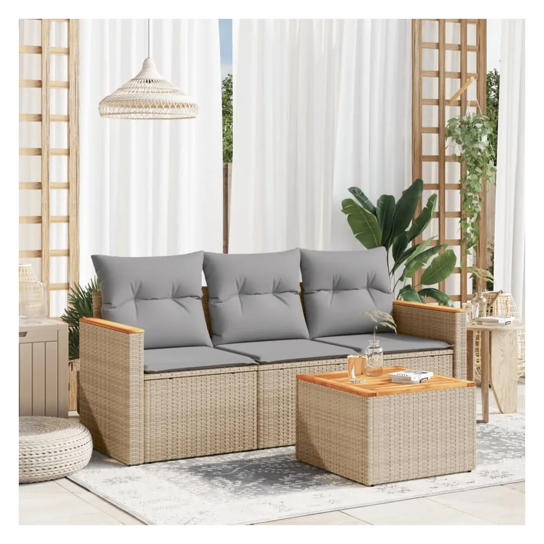 Cet ensemble de canapés de jardin est le complément parfait de votre arrière-cour, terrasse ou patio, offrant un espace confortable et accueillant pour discuter avec la famille et les amis ou simplement se détendre et profiter de l'extérieur. Matériau durable : la résine tressée, également connue sous le nom de poly rotin, est un matériau synthétique solide et nécessitant peu d'entretien qui ressemble au rotin naturel. Il est léger, facile à nettoyer et couramment utilisé pour les meubles d'extérieur en raison de sa durabilité et de ses propriétés de résistance aux intempéries.Fonction de rangement avec sac résistant à l'eau : le mobilier de jardin dispose d'un espace de rangement sous l'assise, complété par un sac résistant à l'eau pour ranger coussins, jouets et autres objets. Le sac intérieur peut être solidement fixé au mobilier d'extérieur grâce à des attaches auto-agrippantes pour plus de stabilité.Dessus stable et facile à nettoyer : cette table de jardin a un dessus en bois d'acacia robuste, durable et facile à nettoyer avec un chiffon humide.Housse amovible et lavable : ces coussins de siège sont dotés de housses amovibles pour un lavage et un entretien faciles.Conception modulaire : cet ensemble de meubles d'extérieur a une conception modulaire, ce qui le rend complètement flexible et facile à déplacer, afin que vous puissiez créer un agencement de meubles d'extérieur personnalisé. Bon à savoir :Pour que vos meubles d'extérieur restent beaux, nous vous recommandons de les protéger avec une housse imperméable.