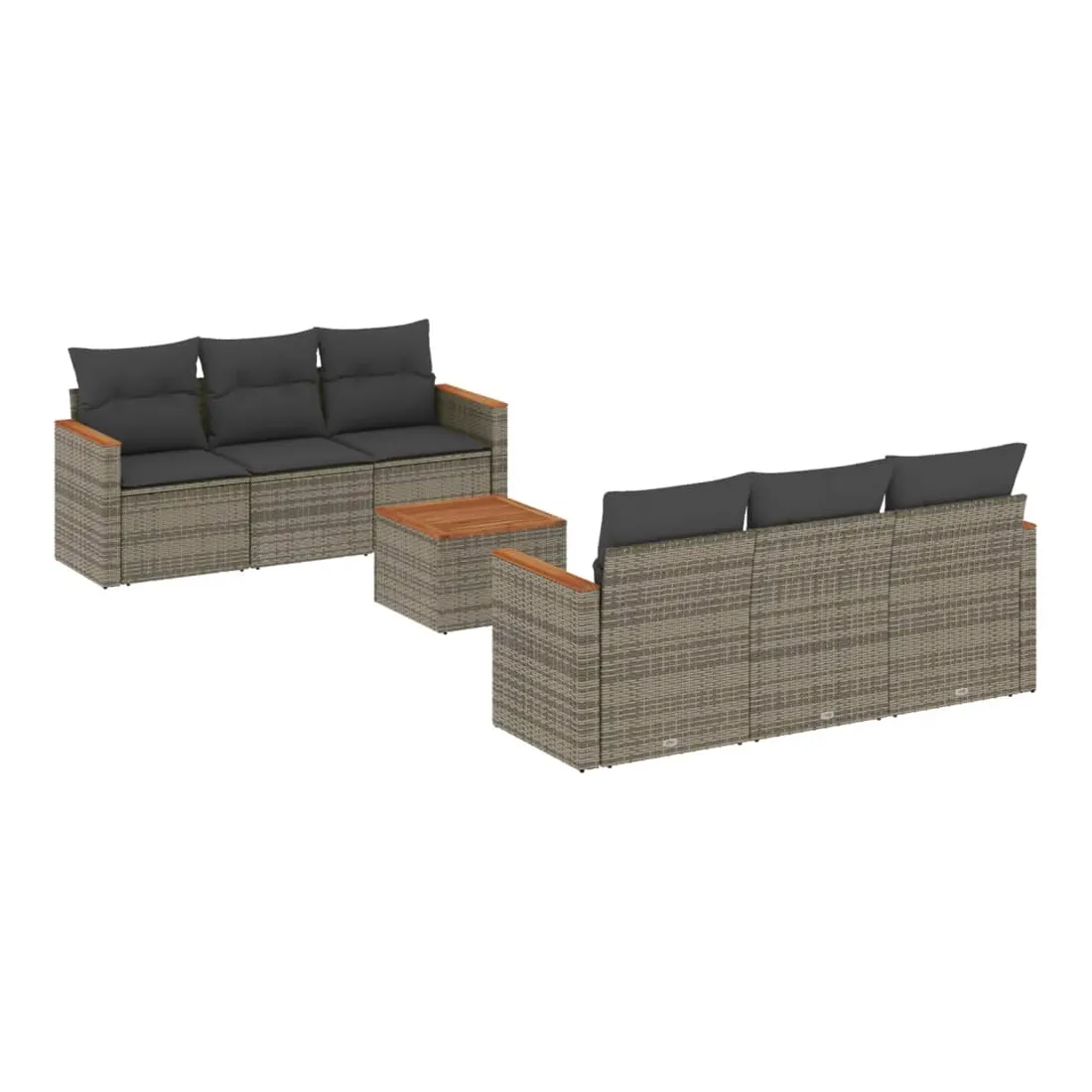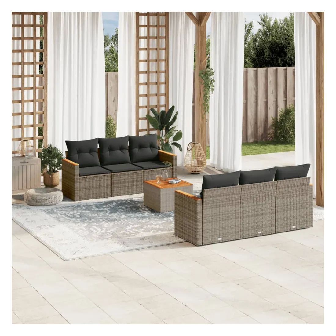 Cet ensemble de canapés de jardin est le complément parfait de votre arrière-cour, terrasse ou patio, offrant un espace confortable et accueillant pour discuter avec la famille et les amis ou simplement se détendre et profiter de l'extérieur. Matériau durable : la résine tressée, également connue sous le nom de poly rotin, est un matériau synthétique solide et nécessitant peu d'entretien qui ressemble au rotin naturel. Il est léger, facile à nettoyer et couramment utilisé pour les meubles d'extérieur en raison de sa durabilité et de ses propriétés de résistance aux intempéries.Fonction de rangement avec sac résistant à l'eau : le mobilier de jardin dispose d'un espace de rangement sous l'assise, complété par un sac résistant à l'eau pour ranger coussins, jouets et autres objets. Le sac intérieur peut être solidement fixé au mobilier d'extérieur grâce à des attaches auto-agrippantes pour plus de stabilité.Dessus stable et facile à nettoyer : cette table de jardin a un dessus en bois d'acacia robuste, durable et facile à nettoyer avec un chiffon humide.Housse amovible et lavable : ces coussins de siège sont dotés de housses amovibles pour un lavage et un entretien faciles.Conception modulaire : cet ensemble de meubles d'extérieur a une conception modulaire, ce qui le rend complètement flexible et facile à déplacer, afin que vous puissiez créer un agencement de meubles d'extérieur personnalisé. Bon à savoir :Pour que vos meubles d'extérieur restent beaux, nous vous recommandons de les protéger avec une housse imperméable.