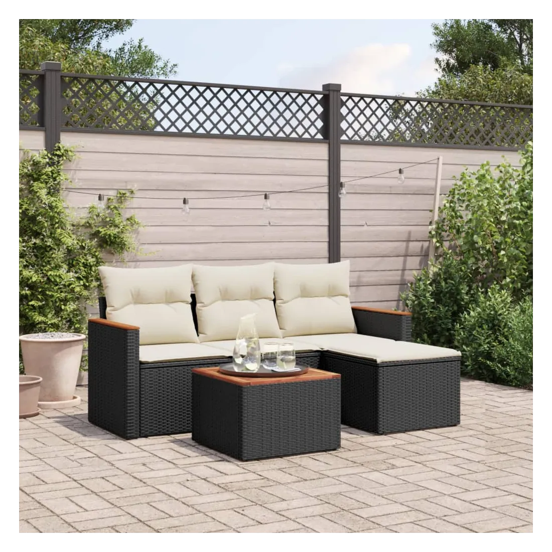 Cet ensemble de canapés de jardin est le complément parfait de votre arrière-cour, terrasse ou patio, offrant un espace confortable et accueillant pour discuter avec la famille et les amis ou simplement se détendre et profiter de l'extérieur. Matériau durable : la résine tressée, également connue sous le nom de poly rotin, est un matériau synthétique solide et nécessitant peu d'entretien qui ressemble au rotin naturel. Il est léger, facile à nettoyer et couramment utilisé pour les meubles d'extérieur en raison de sa durabilité et de ses propriétés de résistance aux intempéries.Fonction de rangement avec sac résistant à l'eau : le mobilier de jardin dispose d'un espace de rangement sous l'assise, complété par un sac résistant à l'eau pour ranger coussins, jouets et autres objets. Le sac intérieur peut être solidement fixé au mobilier d'extérieur grâce à des attaches auto-agrippantes pour plus de stabilité.Dessus stable et facile à nettoyer : cette table de jardin a un dessus en bois d'acacia robuste, durable et facile à nettoyer avec un chiffon humide.Housse amovible et lavable : ces coussins de siège sont dotés de housses amovibles pour un lavage et un entretien faciles.Conception modulaire : cet ensemble de meubles d'extérieur a une conception modulaire, ce qui le rend complètement flexible et facile à déplacer, afin que vous puissiez créer un agencement de meubles d'extérieur personnalisé. Bon à savoir :Pour que vos meubles d'extérieur restent beaux, nous vous recommandons de les protéger avec une housse imperméable.