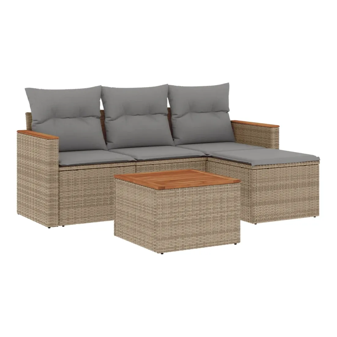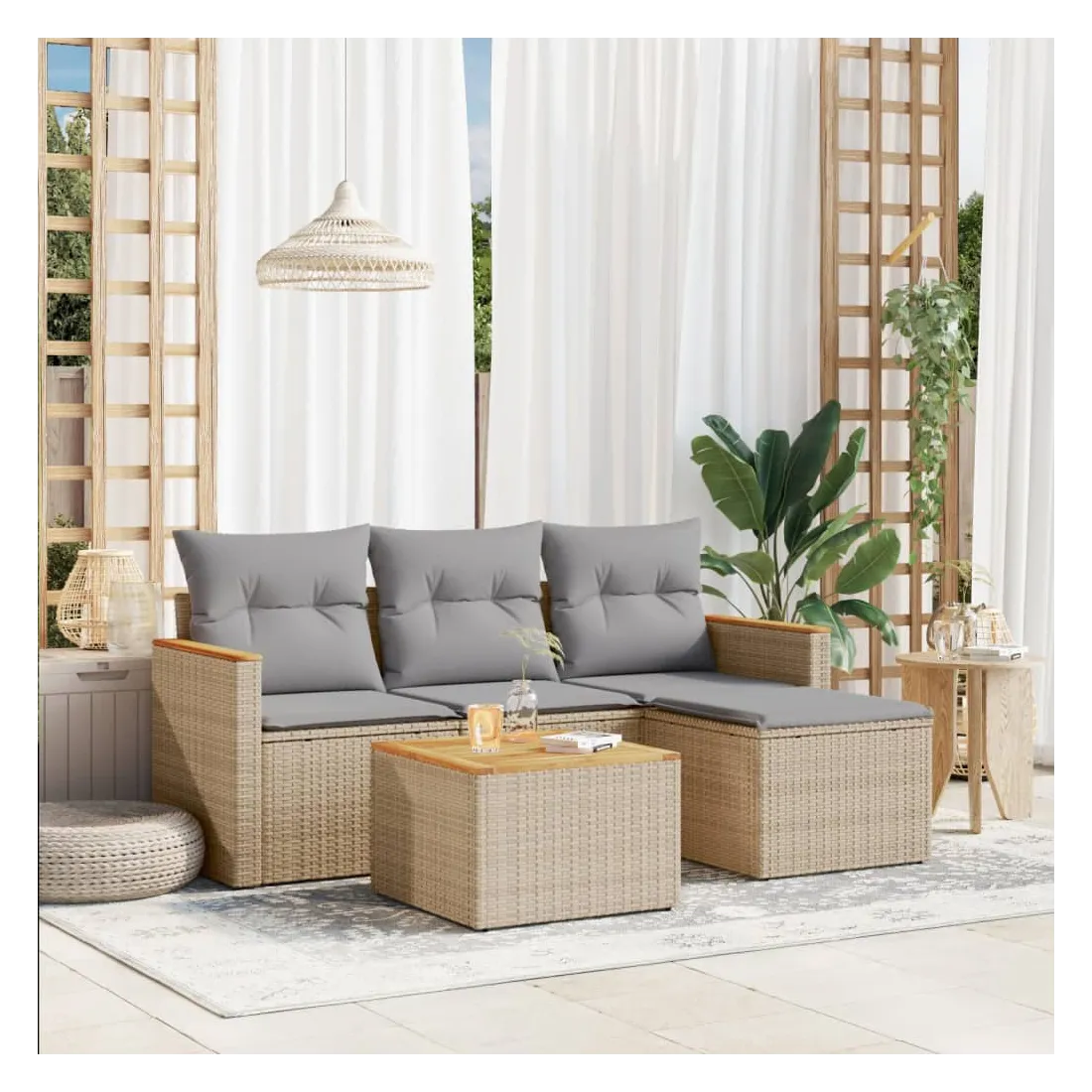 Cet ensemble de canapés de jardin est le complément parfait de votre arrière-cour, terrasse ou patio, offrant un espace confortable et accueillant pour discuter avec la famille et les amis ou simplement se détendre et profiter de l'extérieur. Matériau durable : la résine tressée, également connue sous le nom de poly rotin, est un matériau synthétique solide et nécessitant peu d'entretien qui ressemble au rotin naturel. Il est léger, facile à nettoyer et couramment utilisé pour les meubles d'extérieur en raison de sa durabilité et de ses propriétés de résistance aux intempéries.Fonction de rangement avec sac résistant à l'eau : le mobilier de jardin dispose d'un espace de rangement sous l'assise, complété par un sac résistant à l'eau pour ranger coussins, jouets et autres objets. Le sac intérieur peut être solidement fixé au mobilier d'extérieur grâce à des attaches auto-agrippantes pour plus de stabilité.Dessus stable et facile à nettoyer : cette table de jardin a un dessus en bois d'acacia robuste, durable et facile à nettoyer avec un chiffon humide.Housse amovible et lavable : ces coussins de siège sont dotés de housses amovibles pour un lavage et un entretien faciles.Conception modulaire : cet ensemble de meubles d'extérieur a une conception modulaire, ce qui le rend complètement flexible et facile à déplacer, afin que vous puissiez créer un agencement de meubles d'extérieur personnalisé. Bon à savoir :Pour que vos meubles d'extérieur restent beaux, nous vous recommandons de les protéger avec une housse imperméable.