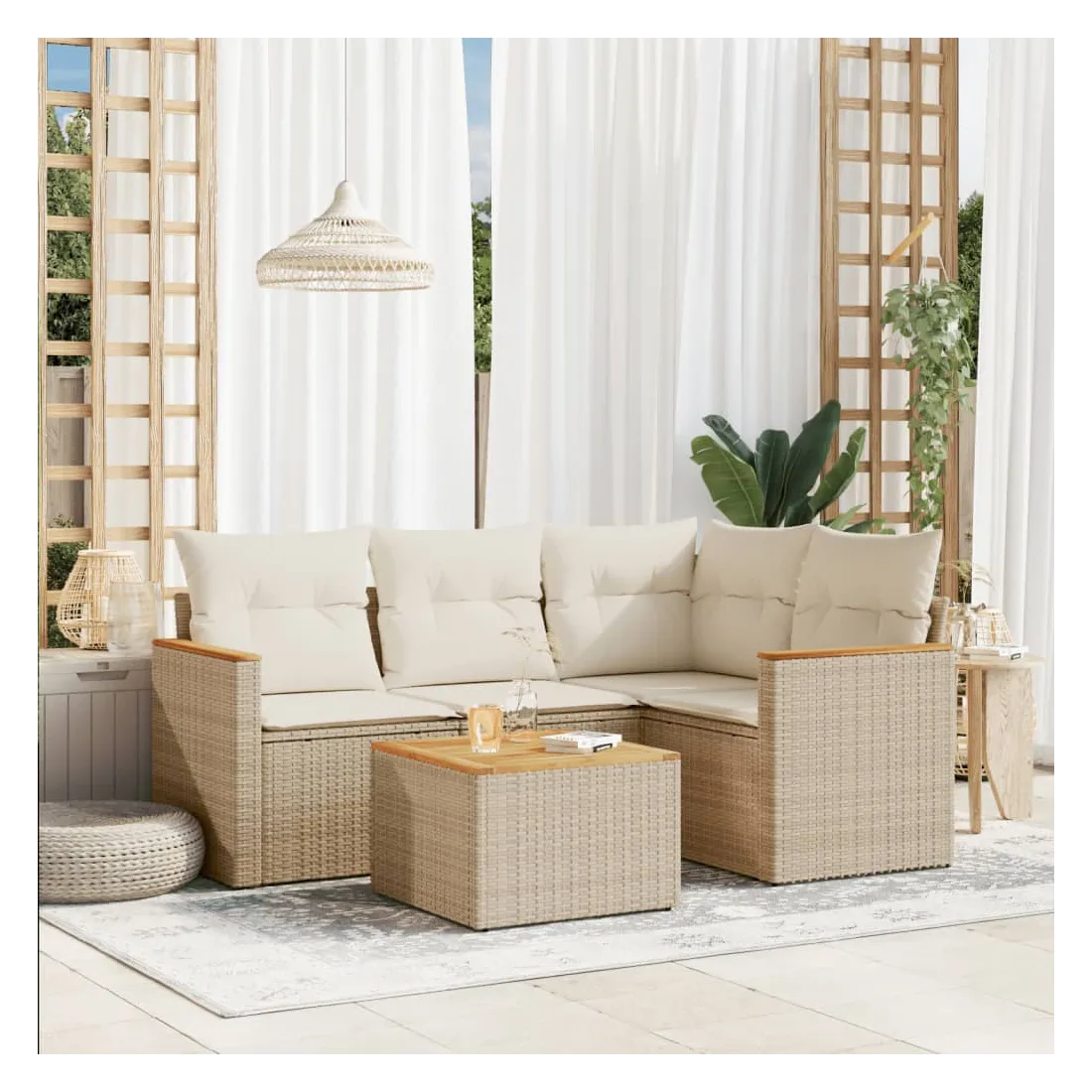 Cet ensemble de canapés de jardin est le complément parfait de votre arrière-cour, terrasse ou patio, offrant un espace confortable et accueillant pour discuter avec la famille et les amis ou simplement se détendre et profiter de l'extérieur. Matériau durable : la résine tressée, également connue sous le nom de poly rotin, est un matériau synthétique solide et nécessitant peu d'entretien qui ressemble au rotin naturel. Il est léger, facile à nettoyer et couramment utilisé pour les meubles d'extérieur en raison de sa durabilité et de ses propriétés de résistance aux intempéries.Fonction de rangement avec sac résistant à l'eau : le mobilier de jardin dispose d'un espace de rangement sous l'assise, complété par un sac résistant à l'eau pour ranger coussins, jouets et autres objets. Le sac intérieur peut être solidement fixé au mobilier d'extérieur grâce à des attaches auto-agrippantes pour plus de stabilité.Dessus stable et facile à nettoyer : cette table de jardin a un dessus en bois d'acacia robuste, durable et facile à nettoyer avec un chiffon humide.Housse amovible et lavable : ces coussins de siège sont dotés de housses amovibles pour un lavage et un entretien faciles.Conception modulaire : cet ensemble de meubles d'extérieur a une conception modulaire, ce qui le rend complètement flexible et facile à déplacer, afin que vous puissiez créer un agencement de meubles d'extérieur personnalisé. Bon à savoir :Pour que vos meubles d'extérieur restent beaux, nous vous recommandons de les protéger avec une housse imperméable.