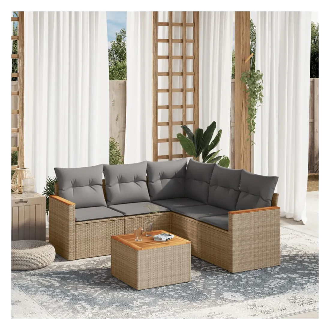 Cet ensemble de canapés de jardin est le complément parfait de votre arrière-cour, terrasse ou patio, offrant un espace confortable et accueillant pour discuter avec la famille et les amis ou simplement se détendre et profiter de l'extérieur. Matériau durable : la résine tressée, également connue sous le nom de poly rotin, est un matériau synthétique solide et nécessitant peu d'entretien qui ressemble au rotin naturel. Il est léger, facile à nettoyer et couramment utilisé pour les meubles d'extérieur en raison de sa durabilité et de ses propriétés de résistance aux intempéries.Fonction de rangement avec sac résistant à l'eau : le mobilier de jardin dispose d'un espace de rangement sous l'assise, complété par un sac résistant à l'eau pour ranger coussins, jouets et autres objets. Le sac intérieur peut être solidement fixé au mobilier d'extérieur grâce à des attaches auto-agrippantes pour plus de stabilité.Dessus stable et facile à nettoyer : cette table de jardin a un dessus en bois d'acacia robuste, durable et facile à nettoyer avec un chiffon humide.Housse amovible et lavable : ces coussins de siège sont dotés de housses amovibles pour un lavage et un entretien faciles.Conception modulaire : cet ensemble de meubles d'extérieur a une conception modulaire, ce qui le rend complètement flexible et facile à déplacer, afin que vous puissiez créer un agencement de meubles d'extérieur personnalisé. Bon à savoir :Pour que vos meubles d'extérieur restent beaux, nous vous recommandons de les protéger avec une housse imperméable.