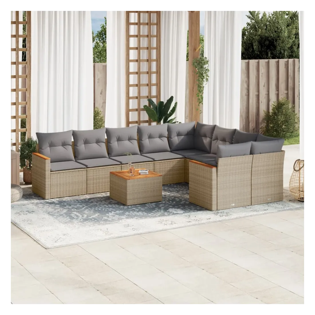 Cet ensemble de canapés de jardin est le complément parfait de votre arrière-cour, terrasse ou patio, offrant un espace confortable et accueillant pour discuter avec la famille et les amis ou simplement se détendre et profiter de l'extérieur. Matériau durable : la résine tressée, également connue sous le nom de poly rotin, est un matériau synthétique solide et nécessitant peu d'entretien qui ressemble au rotin naturel. Il est léger, facile à nettoyer et couramment utilisé pour les meubles d'extérieur en raison de sa durabilité et de ses propriétés de résistance aux intempéries.Fonction de rangement avec sac résistant à l'eau : le mobilier de jardin dispose d'un espace de rangement sous l'assise, complété par un sac résistant à l'eau pour ranger coussins, jouets et autres objets. Le sac intérieur peut être solidement fixé au mobilier d'extérieur grâce à des attaches auto-agrippantes pour plus de stabilité.Dessus stable et facile à nettoyer : cette table de jardin a un dessus en bois d'acacia robuste, durable et facile à nettoyer avec un chiffon humide.Housse amovible et lavable : ces coussins de siège sont dotés de housses amovibles pour un lavage et un entretien faciles.Conception modulaire : cet ensemble de meubles d'extérieur a une conception modulaire, ce qui le rend complètement flexible et facile à déplacer, afin que vous puissiez créer un agencement de meubles d'extérieur personnalisé. Bon à savoir :Pour que vos meubles d'extérieur restent beaux, nous vous recommandons de les protéger avec une housse imperméable.