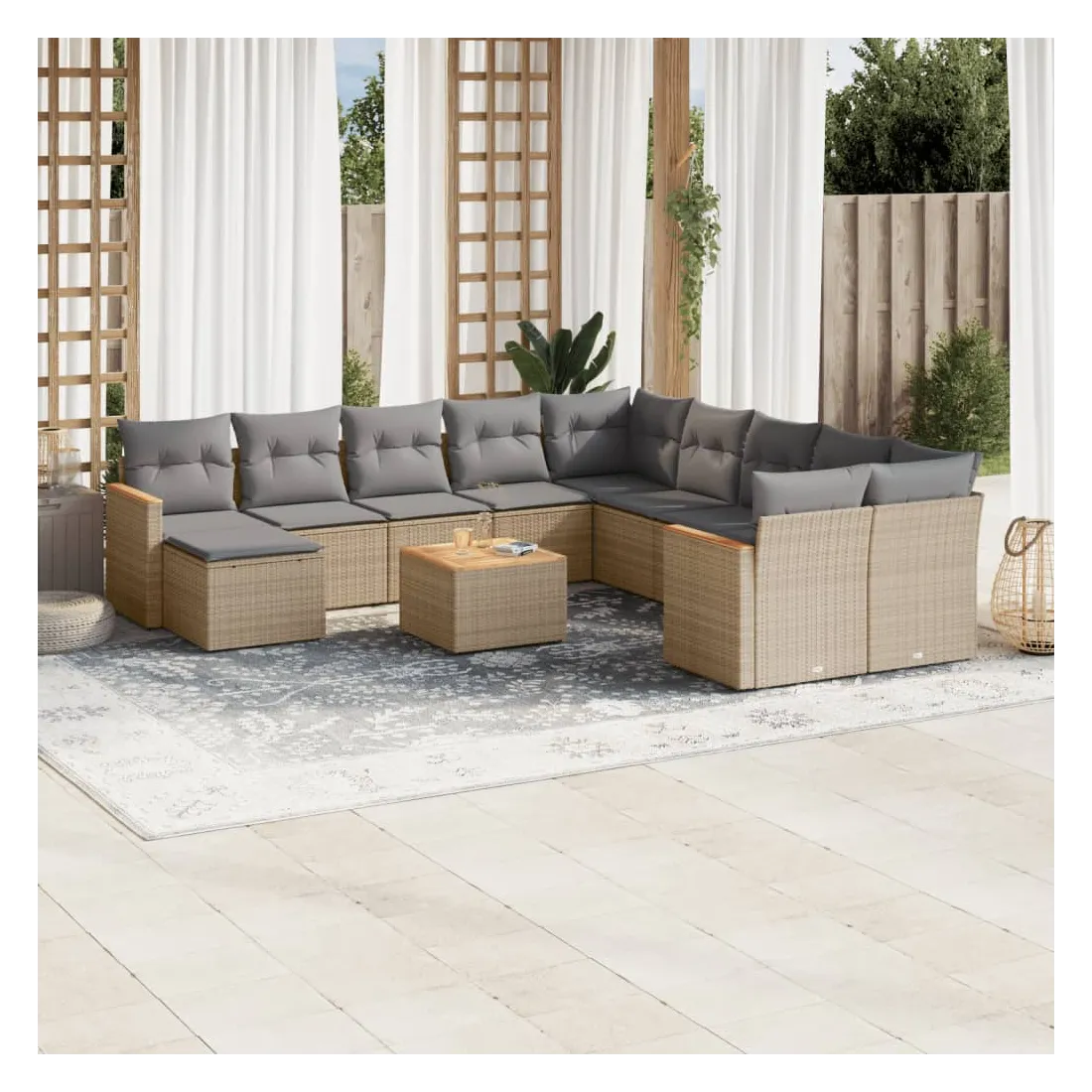 Cet ensemble de canapés de jardin est le complément parfait de votre arrière-cour, terrasse ou patio, offrant un espace confortable et accueillant pour discuter avec la famille et les amis ou simplement se détendre et profiter de l'extérieur. Matériau durable : la résine tressée, également connue sous le nom de poly rotin, est un matériau synthétique solide et nécessitant peu d'entretien qui ressemble au rotin naturel. Il est léger, facile à nettoyer et couramment utilisé pour les meubles d'extérieur en raison de sa durabilité et de ses propriétés de résistance aux intempéries.Fonction de rangement avec sac résistant à l'eau : le mobilier de jardin dispose d'un espace de rangement sous l'assise, complété par un sac résistant à l'eau pour ranger coussins, jouets et autres objets. Le sac intérieur peut être solidement fixé au mobilier d'extérieur grâce à des attaches auto-agrippantes pour plus de stabilité.Dessus stable et facile à nettoyer : cette table de jardin a un dessus en bois d'acacia robuste, durable et facile à nettoyer avec un chiffon humide.Housse amovible et lavable : ces coussins de siège sont dotés de housses amovibles pour un lavage et un entretien faciles.Conception modulaire : cet ensemble de meubles d'extérieur a une conception modulaire, ce qui le rend complètement flexible et facile à déplacer, afin que vous puissiez créer un agencement de meubles d'extérieur personnalisé. Bon à savoir :Pour que vos meubles d'extérieur restent beaux, nous vous recommandons de les protéger avec une housse imperméable.