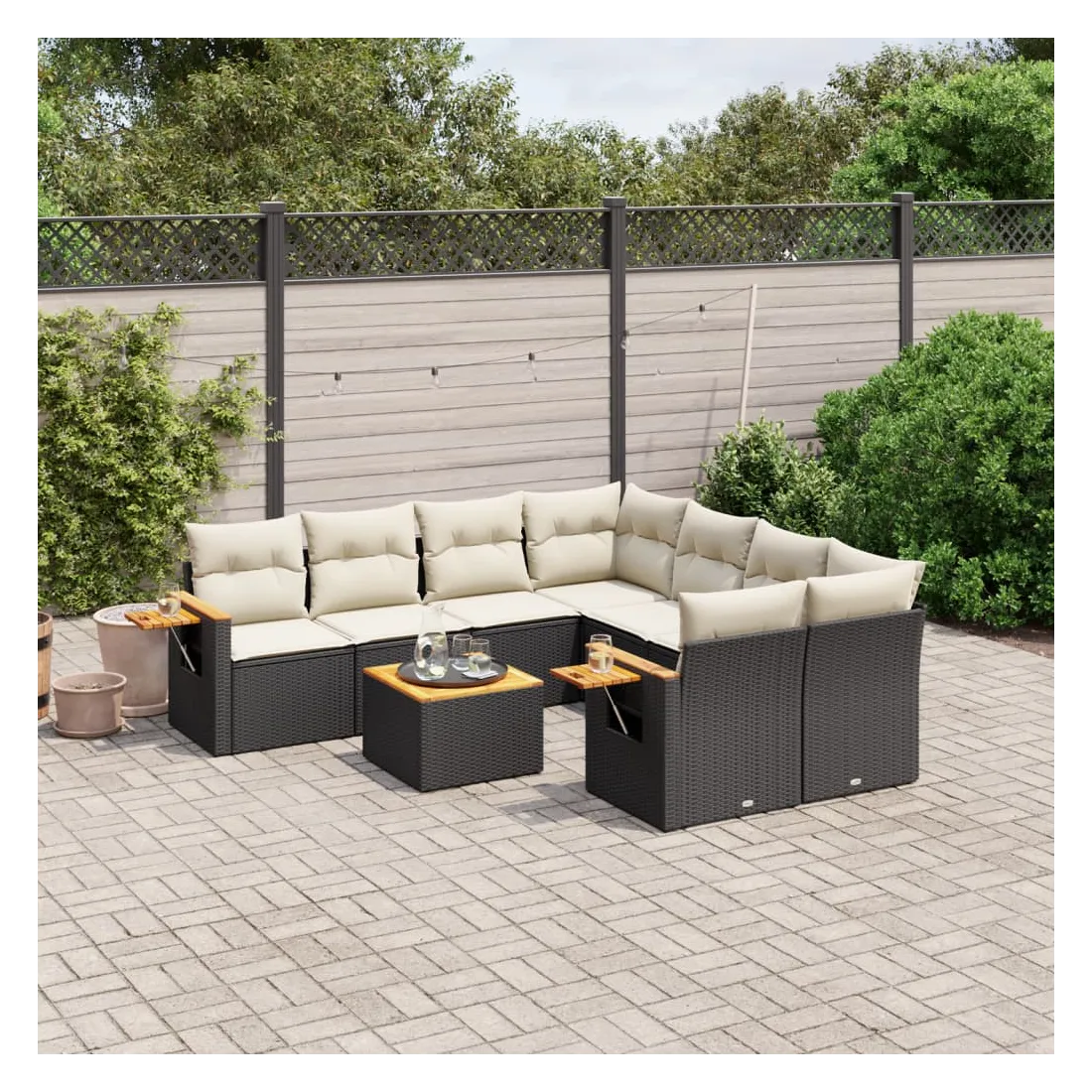 Cet ensemble de canapés de jardin est le complément parfait de votre arrière-cour, terrasse ou patio, offrant un espace confortable et accueillant pour discuter avec la famille et les amis ou simplement se détendre et profiter de l'extérieur. Matériau durable : la résine tressée, également connue sous le nom de poly rotin, est un matériau synthétique solide et nécessitant peu d'entretien qui ressemble au rotin naturel. Il est léger, facile à nettoyer et couramment utilisé pour les meubles d'extérieur en raison de sa durabilité et de ses propriétés de résistance aux intempéries.Fonction de rangement avec sac résistant à l'eau : le mobilier de jardin dispose d'un espace de rangement sous l'assise, complété par un sac résistant à l'eau pour ranger coussins, jouets et autres objets. Le sac intérieur peut être solidement fixé au mobilier d'extérieur grâce à des attaches auto-agrippantes pour plus de stabilité.Table d'appoint pratique : ce mobilier d'extérieur comprend une table d'appoint pliable avec un ressort à gaz sur les accoudoirs, offrant un endroit pratique pour garder vos essentiels à portée de main.Housse amovible et lavable : ces coussins de siège sont dotés de housses amovibles pour un lavage et un entretien faciles.Conception modulaire : cet ensemble de meubles d'extérieur a une conception modulaire, ce qui le rend complètement flexible et facile à déplacer, afin que vous puissiez créer un agencement de meubles d'extérieur personnalisé. Bon à savoir :Pour que vos meubles d'extérieur restent beaux, nous vous recommandons de les protéger avec une housse imperméable.