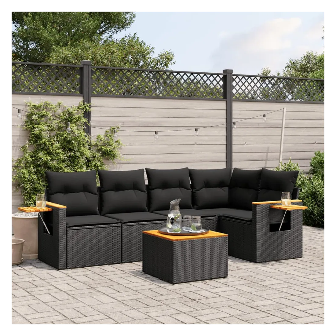 Salon de jardin 6 pcs avec coussins noir résine tressée