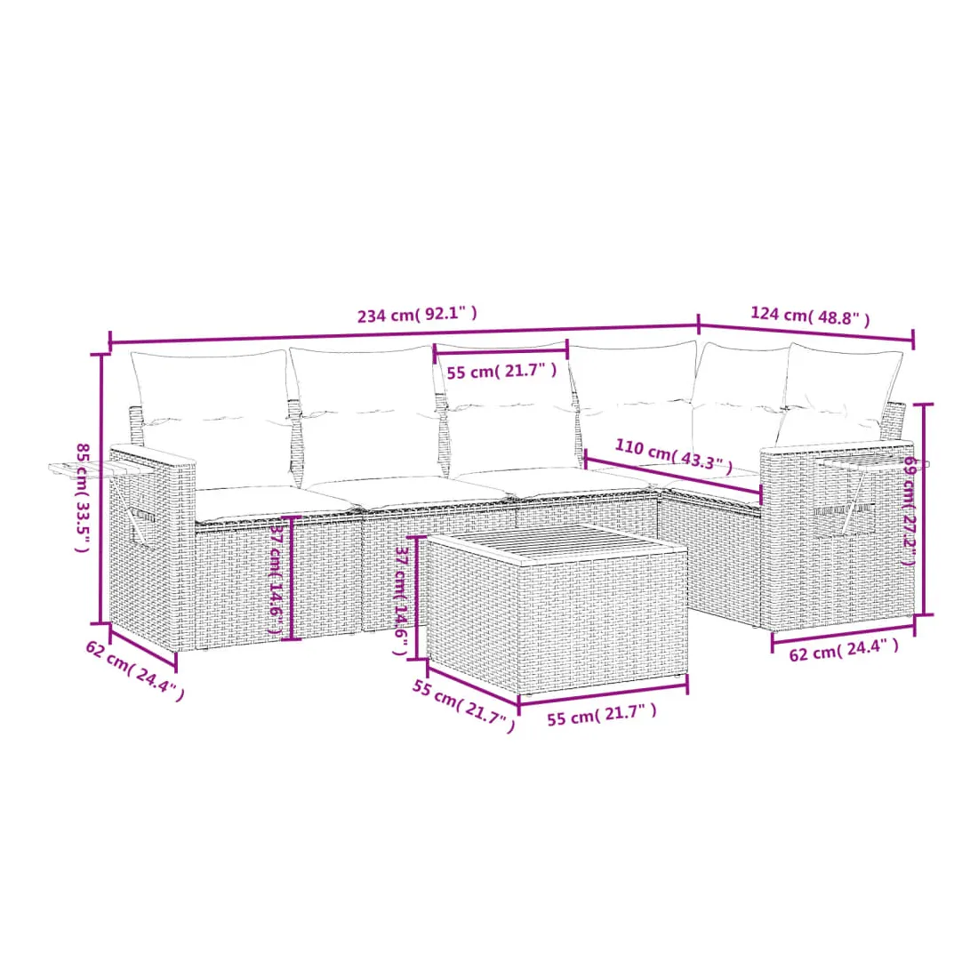 Cet ensemble de canapés de jardin est le complément parfait de votre arrière-cour, terrasse ou patio, offrant un espace confortable et accueillant pour discuter avec la famille et les amis ou simplement se détendre et profiter de l'extérieur. Matériau durable : la résine tressée, également connue sous le nom de poly rotin, est un matériau synthétique solide et nécessitant peu d'entretien qui ressemble au rotin naturel. Il est léger, facile à nettoyer et couramment utilisé pour les meubles d'extérieur en raison de sa durabilité et de ses propriétés de résistance aux intempéries.Fonction de rangement avec sac résistant à l'eau : le mobilier de jardin dispose d'un espace de rangement sous l'assise, complété par un sac résistant à l'eau pour ranger coussins, jouets et autres objets. Le sac intérieur peut être solidement fixé au mobilier d'extérieur grâce à des attaches auto-agrippantes pour plus de stabilité.Table d'appoint pratique : ce mobilier d'extérieur comprend une table d'appoint pliable avec un ressort à gaz sur les accoudoirs, offrant un endroit pratique pour garder vos essentiels à portée de main.Housse amovible et lavable : ces coussins de siège sont dotés de housses amovibles pour un lavage et un entretien faciles.Conception modulaire : cet ensemble de meubles d'extérieur a une conception modulaire, ce qui le rend complètement flexible et facile à déplacer, afin que vous puissiez créer un agencement de meubles d'extérieur personnalisé. Bon à savoir :Pour que vos meubles d'extérieur restent beaux, nous vous recommandons de les protéger avec une housse imperméable.