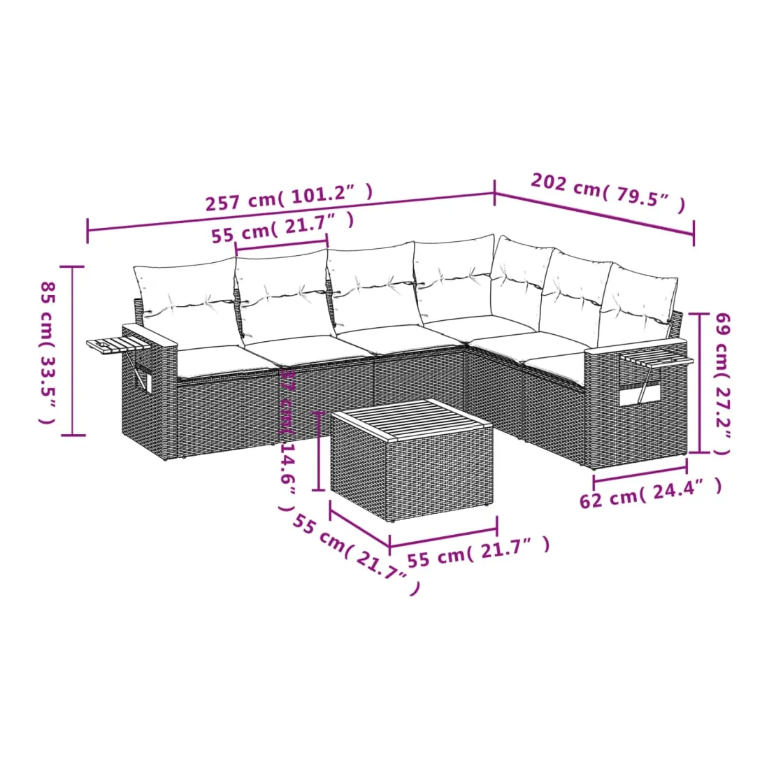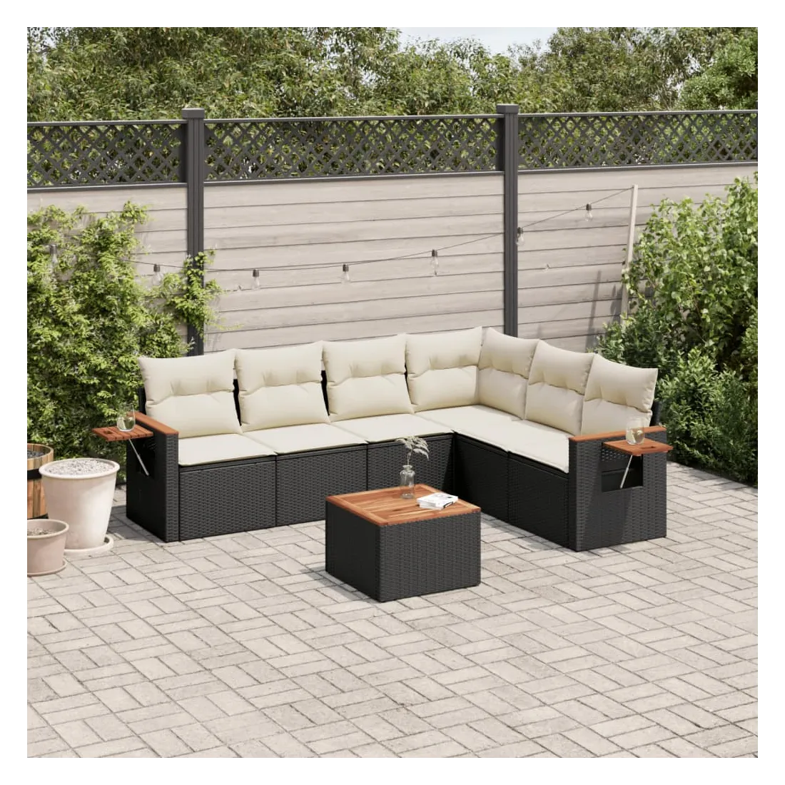 Cet ensemble de canapés de jardin est le complément parfait de votre arrière-cour, terrasse ou patio, offrant un espace confortable et accueillant pour discuter avec la famille et les amis ou simplement se détendre et profiter de l'extérieur. Matériau durable : la résine tressée, également connue sous le nom de poly rotin, est un matériau synthétique solide et nécessitant peu d'entretien qui ressemble au rotin naturel. Il est léger, facile à nettoyer et couramment utilisé pour les meubles d'extérieur en raison de sa durabilité et de ses propriétés de résistance aux intempéries.Fonction de rangement avec sac résistant à l'eau : le mobilier de jardin dispose d'un espace de rangement sous l'assise, complété par un sac résistant à l'eau pour ranger coussins, jouets et autres objets. Le sac intérieur peut être solidement fixé au mobilier d'extérieur grâce à des attaches auto-agrippantes pour plus de stabilité.Table d'appoint pratique : ce mobilier d'extérieur comprend une table d'appoint pliable avec un ressort à gaz sur les accoudoirs, offrant un endroit pratique pour garder vos essentiels à portée de main.Housse amovible et lavable : ces coussins de siège sont dotés de housses amovibles pour un lavage et un entretien faciles.Conception modulaire : cet ensemble de meubles d'extérieur a une conception modulaire, ce qui le rend complètement flexible et facile à déplacer, afin que vous puissiez créer un agencement de meubles d'extérieur personnalisé. Bon à savoir :Pour que vos meubles d'extérieur restent beaux, nous vous recommandons de les protéger avec une housse imperméable.