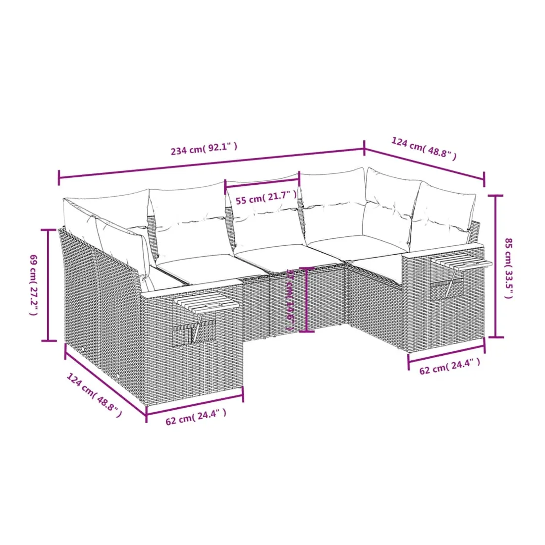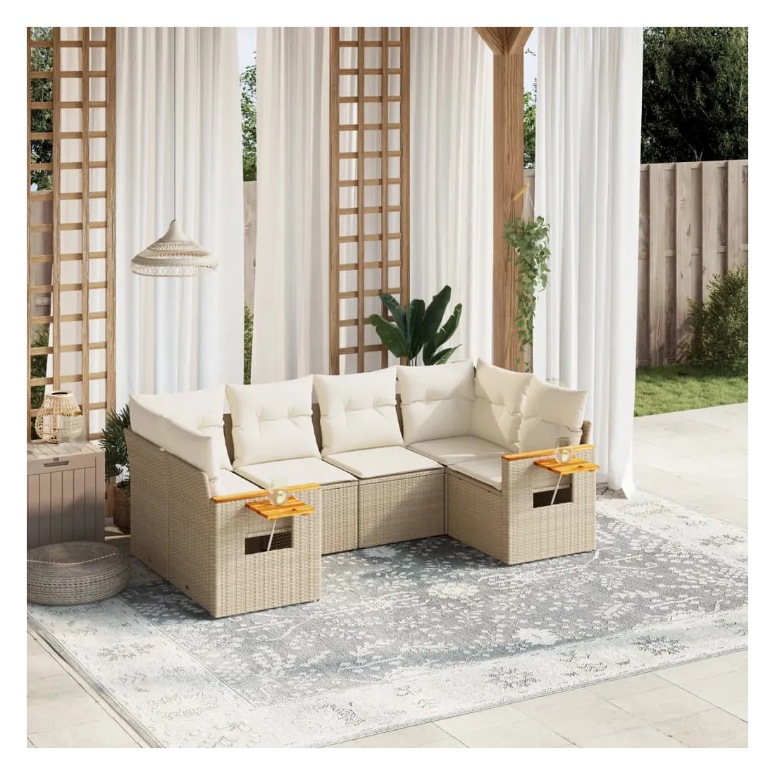 Cet ensemble de canapés de jardin est le complément parfait de votre arrière-cour, terrasse ou patio, offrant un espace confortable et accueillant pour discuter avec la famille et les amis ou simplement se détendre et profiter de l'extérieur. Matériau durable : la résine tressée, également connue sous le nom de poly rotin, est un matériau synthétique solide et nécessitant peu d'entretien qui ressemble au rotin naturel. Il est léger, facile à nettoyer et couramment utilisé pour les meubles d'extérieur en raison de sa durabilité et de ses propriétés de résistance aux intempéries.Fonction de rangement avec sac résistant à l'eau : le mobilier de jardin dispose d'un espace de rangement sous l'assise, complété par un sac résistant à l'eau pour ranger coussins, jouets et autres objets. Le sac intérieur peut être solidement fixé au mobilier d'extérieur grâce à des attaches auto-agrippantes pour plus de stabilité.Table d'appoint pratique : ce mobilier d'extérieur comprend une table d'appoint pliable avec un ressort à gaz sur les accoudoirs, offrant un endroit pratique pour garder vos essentiels à portée de main.Housse amovible et lavable : ces coussins de siège sont dotés de housses amovibles pour un lavage et un entretien faciles.Conception modulaire : cet ensemble de meubles d'extérieur a une conception modulaire, ce qui le rend complètement flexible et facile à déplacer, afin que vous puissiez créer un agencement de meubles d'extérieur personnalisé. Bon à savoir :Pour que vos meubles d'extérieur restent beaux, nous vous recommandons de les protéger avec une housse imperméable.