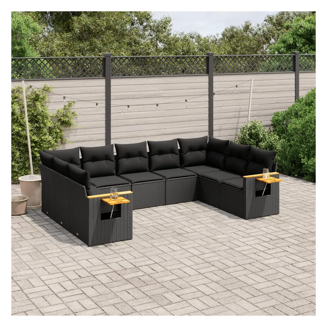 Salon de jardin 9 pcs avec coussins noir résine tressée
