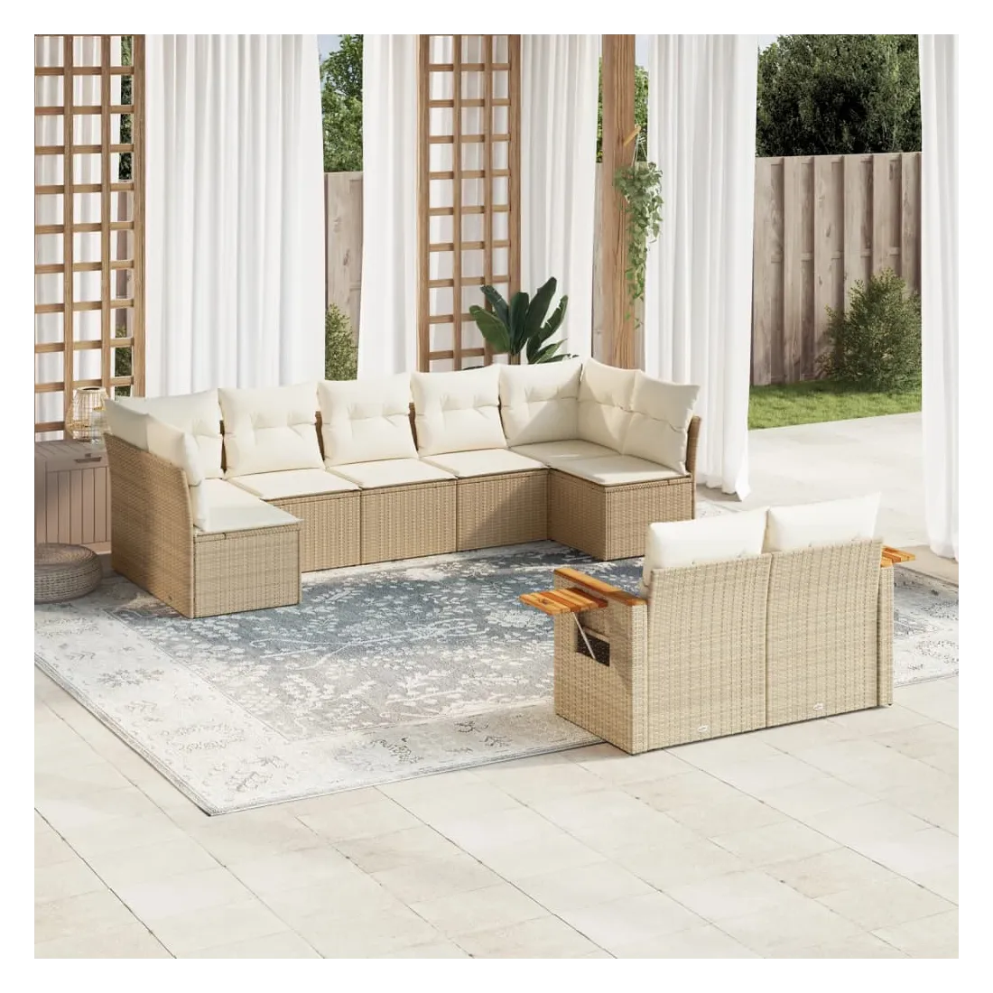 Cet ensemble de canapés de jardin est le complément parfait de votre arrière-cour, terrasse ou patio, offrant un espace confortable et accueillant pour discuter avec la famille et les amis ou simplement se détendre et profiter de l'extérieur. Matériau durable : la résine tressée, également connue sous le nom de poly rotin, est un matériau synthétique solide et nécessitant peu d'entretien qui ressemble au rotin naturel. Il est léger, facile à nettoyer et couramment utilisé pour les meubles d'extérieur en raison de sa durabilité et de ses propriétés de résistance aux intempéries.Fonction de rangement avec sac résistant à l'eau : le mobilier de jardin dispose d'un espace de rangement sous l'assise, complété par un sac résistant à l'eau pour ranger coussins, jouets et autres objets. Le sac intérieur peut être solidement fixé au mobilier d'extérieur grâce à des attaches auto-agrippantes pour plus de stabilité.Table d'appoint pratique : ce mobilier d'extérieur comprend une table d'appoint pliable avec un ressort à gaz sur les accoudoirs, offrant un endroit pratique pour garder vos essentiels à portée de main.Housse amovible et lavable : ces coussins de siège sont dotés de housses amovibles pour un lavage et un entretien faciles.Conception modulaire : cet ensemble de meubles d'extérieur a une conception modulaire, ce qui le rend complètement flexible et facile à déplacer, afin que vous puissiez créer un agencement de meubles d'extérieur personnalisé. Bon à savoir :Pour que vos meubles d'extérieur restent beaux, nous vous recommandons de les protéger avec une housse imperméable.